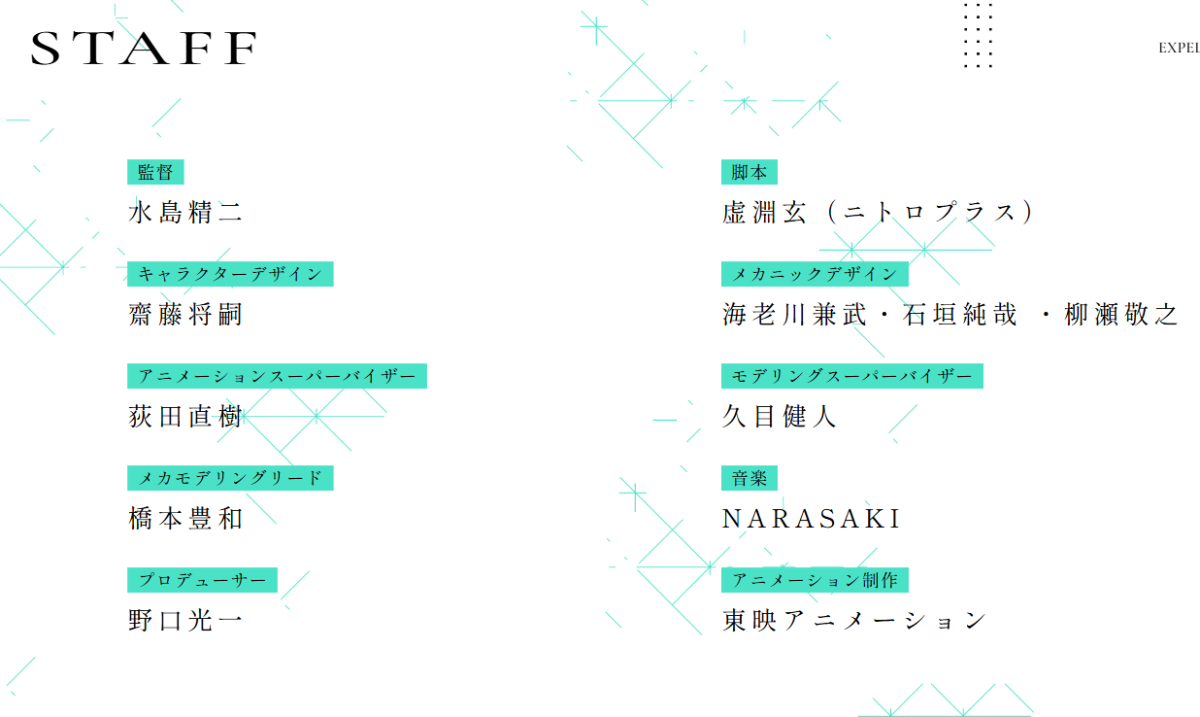 由水島精二執導,虛淵玄編劇,東映動畫與Nitro+合作製作在 2014 年上映的動畫電影《樂園追放 -Expelled from Paradise-》,當初以結合宇宙及科幻世界觀的元素吸引不少觀眾喜愛。