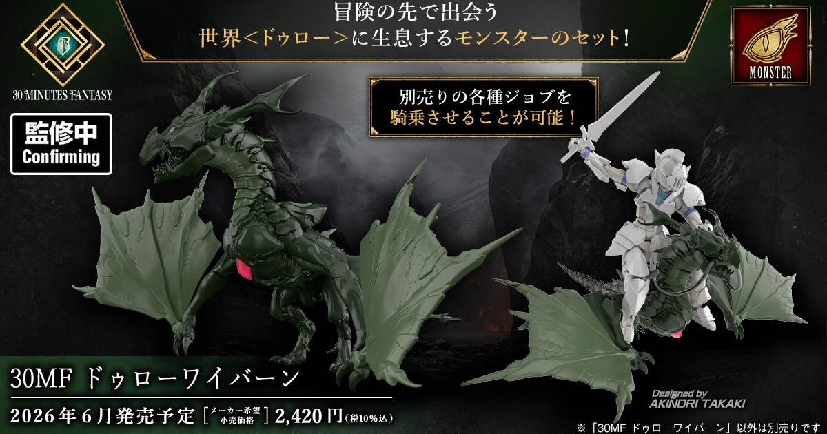 新推出的「卓爾雙足飛龍」是棲息在故事背景世界、在冒險途中會遭遇的怪物之一,同時也被馴養為飛行坐騎。套件深綠、淺綠兩種成型色零件構成飛龍本體,造型融合了生物肌肉線條、鱗片與全身各部的金屬鎧甲,胸口紅色的元素核心使用透明零件製作。四肢具備靈活的可動關節,羽翼和眼罩具備開閉機構,藉由背部的鞍與韁繩零件就能成為坐騎,搭配 30MF 系列角色進行騎乘。