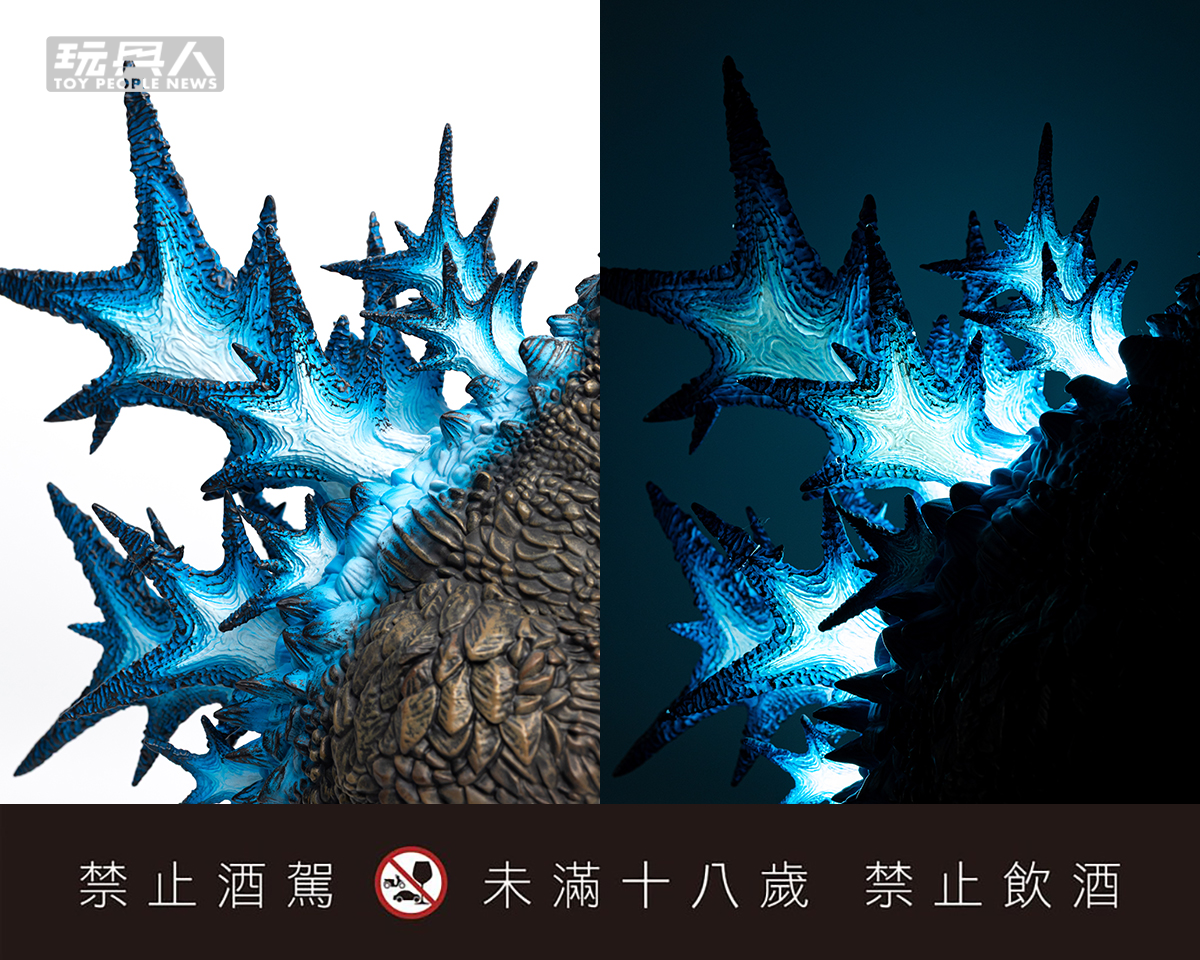在上回展現金屬質感魅力的「機械哥吉拉(2003)款」之後,這次鑫羿文創再度將製作重點放在哥吉拉極具生物感的表皮鱗片刻畫與紋理複雜的背鰭雕琢上,從任何角度看都能感受到負一哥栩栩如生的壓迫感!而「哥吉拉-1.0款・熱線版」則將背鰭、口腔施以藍色塗裝,並表現出由白轉藍的優秀漸層,點亮(Type-C 供電)之後真的相當帥氣,如果是在黑暗中發光即可感受到更加強烈的臨場感。