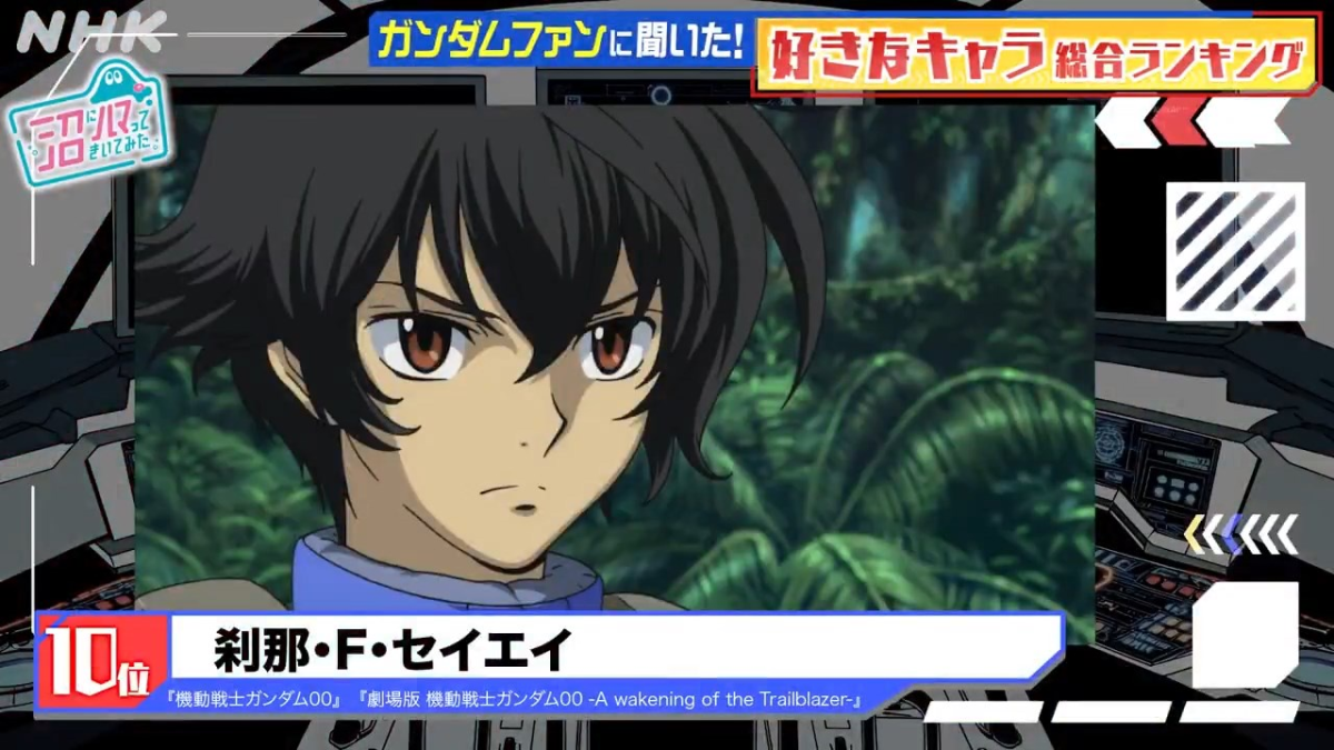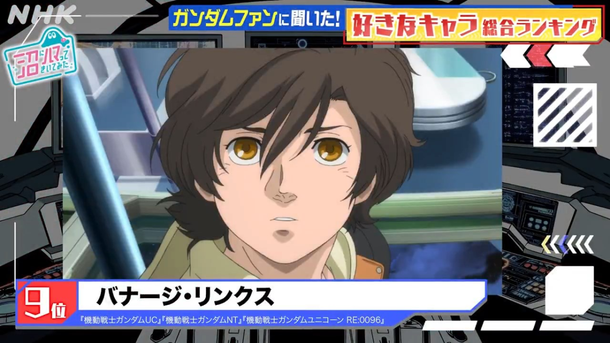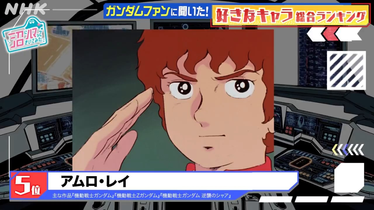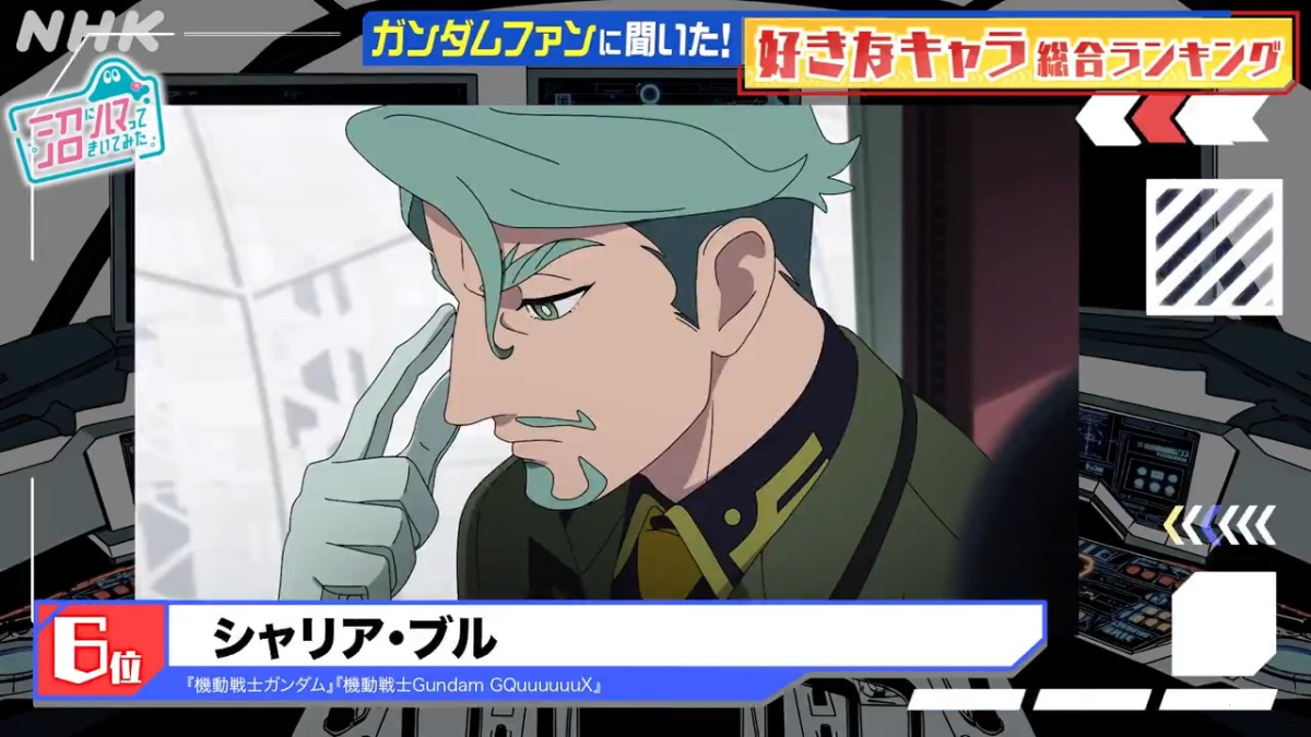 有趣的是,這次節目會一次公開超過萬名鋼彈粉絲進行的大規模問卷結果,包含「最喜歡的經典名場面」、「最喜歡的音樂」、「最喜歡的 MS/MA」等排行榜,其中「最喜歡的角色」也先行於節目預告中公布。