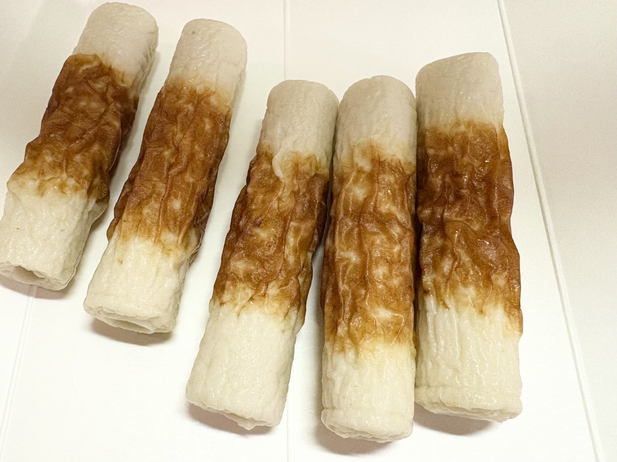 這下其他路過的網友們都回不去了,大家都已經看成了竹輪,不過比起討論竹輪LOGO,更多的是在稱讚ゴート的強大刀工和天才想法,居然真用竹輪去排標題是網友們沒想到的。至於切下來的部分和標題LOGO用的竹輪已經被ゴート很美味地吃掉了,還附上炸過後灑海苔粉的竹輪版LOGO照。
