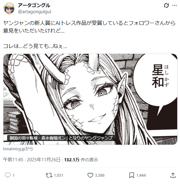 集英社舉辦的「Young Jump 新人漫畫大賞」(第36回),其中得獎作品《御国の羽々斬様》(作者:森永侮瑠戊ン),被不少X網友質疑疑似使用 AI 作畫,雖說並未被證實,卻已經在日本X上掀起討論,質疑使用AI到底能不能報名比賽。