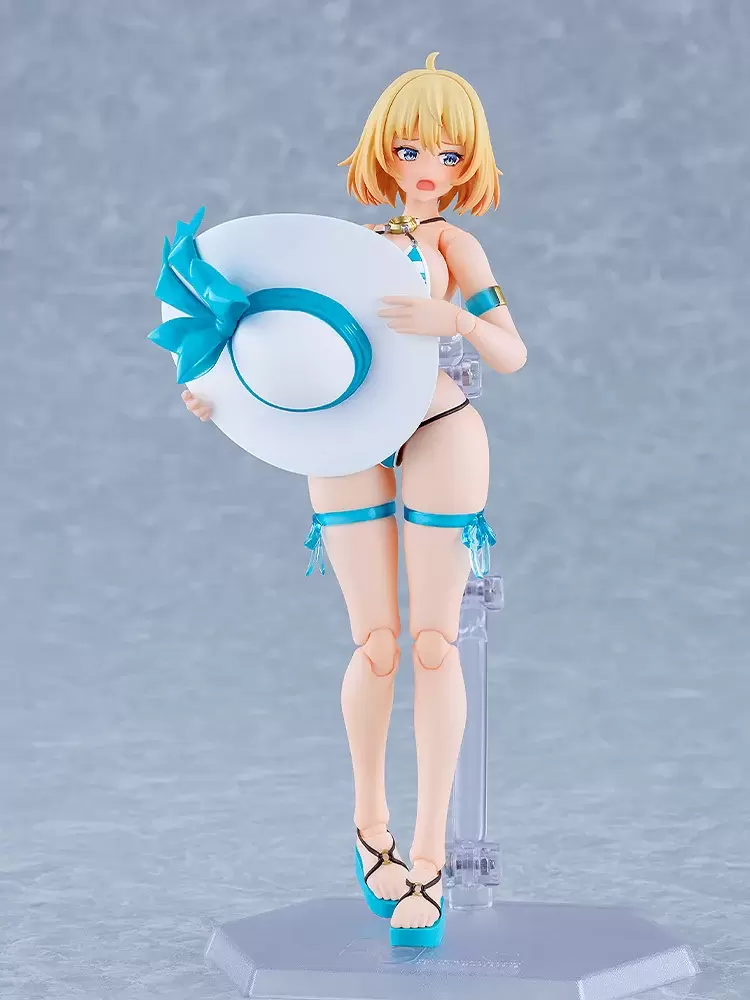 最新作「figma Sophia F. Shirring 泳裝Ver.」採用全高約 15 公分的可動人偶規格製作,以細膩造型再現由綁繩、極少布料、薄紗、緞帶構成的性感泳裝造型,以及極為豐滿的姣好身材。薄紗裙使用透明材質、圖樣印刷重現,和遮陽帽一樣能自由穿脫,腳掌以替換零件方式也能脫下涼鞋,透過靈活且不易露出破綻的可動關節設計,就能把玩出各種性感可愛的姿勢。