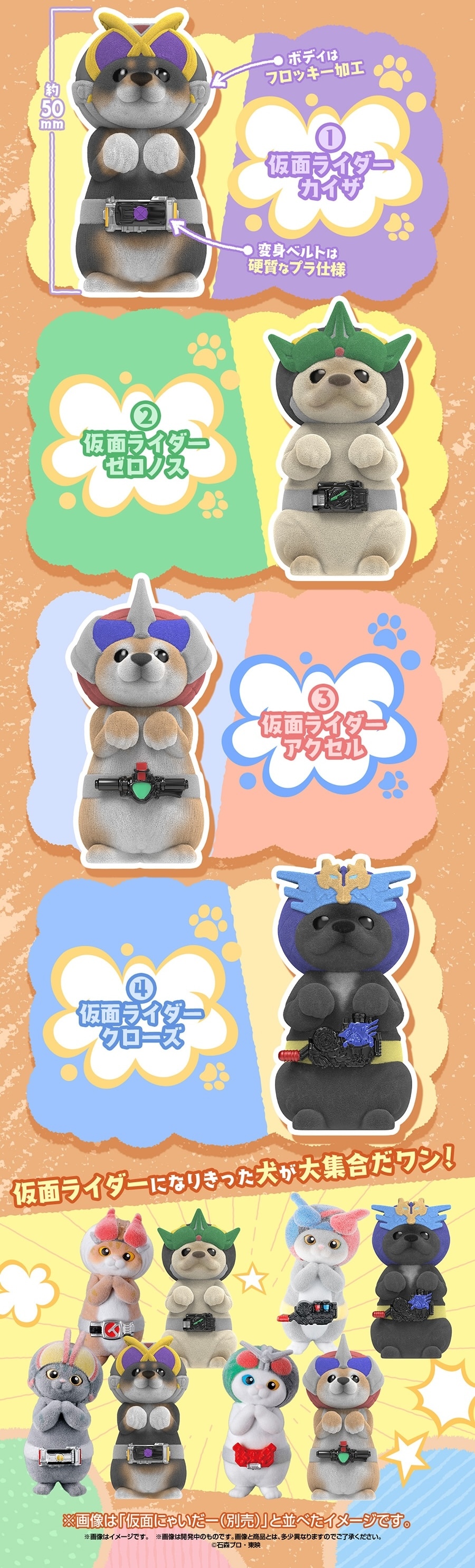 繼大受歡迎的「假喵騎士系列」第一彈和第二彈之後,這次輪到狗狗變身成假面騎士啦!本次的假汪騎士以將日文中狗狗叫聲的「汪」(わん)融入假面騎士(仮面ライダー)作為發想,將狗狗的造型與作品中的二騎結合,收錄《假面騎士555》中的假面騎士 Kaixa、《假面騎士電王》中的假面騎士零神(Zeronos)、《假面騎士W》中的假面騎士 Accel 以及《假面騎士Build》中的假面騎士Cross-Z 共四種款式,在約 5 公分高的大小下雕刻還原了腰帶及頭盔的形象,並同樣採用了植絨加工技術打造,摸起來超級療癒,有著視覺和觸覺的雙重享受,還可以與先前推出的主騎貓貓們一起擺設,加倍可愛!