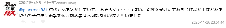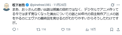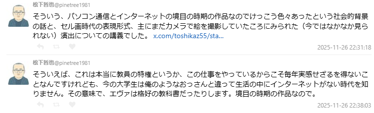 推主也表示,他並不要求學生能百分之百感受當年的震撼,而是要他們理解《新世紀福音戰士》是如何在一個沒有網路、資訊零散的年代,改變整個動畫語境。對於漫畫/動畫專門科系的學生而言,《新世紀福音戰士》並非只是作品,而是教材─一部誕生在歷史交界點、象徵時代變動的代表作。