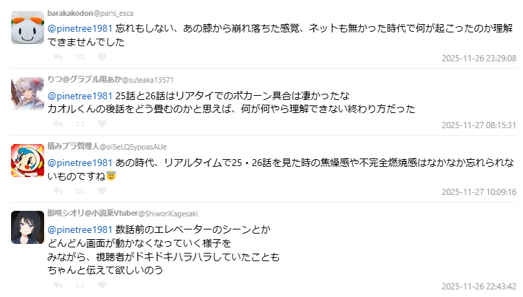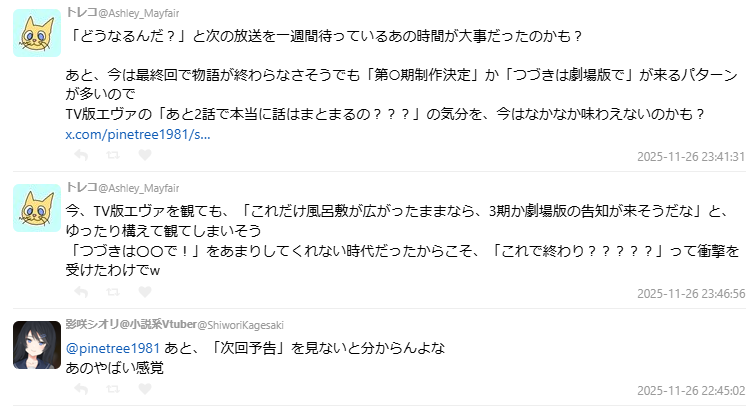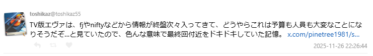 多名網友指出,《新世紀福音戰士》誕生於電腦通訊向網路邁進的交界點。當時沒有即時社群與官方在社群解釋,觀眾只能靠各種零碎情報推測製作狀況,也因此在接近最終回時,各界都懷疑「預算跟人手是不是撐不住了」。因此在只剩兩集時,大家都在問:「真的收得起來嗎?」最後的25、26話突然轉向心理劇式表現,更讓大家完全無法預測,普遍呈現「膝蓋軟掉」、「完全不懂自己看了什麼」的震撼狀態。