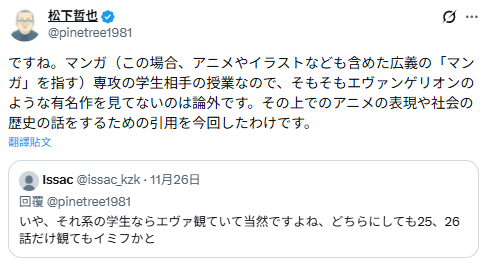 該名推主松下哲也(@pinetree1981)分享,他在課堂上播放《新世紀福音戰士》TV版第25、26話時,學生一邊看一邊露出複雜又尷尬的笑容。但他強調,90年代播出時是現象級作品,觀眾每週都在期待結局「結果最後兩集這樣播出來,整個被震撼到不行」。他也坦言,要向現在的大學生傳達那年頭的空氣感和衝擊,「真的超難」。
