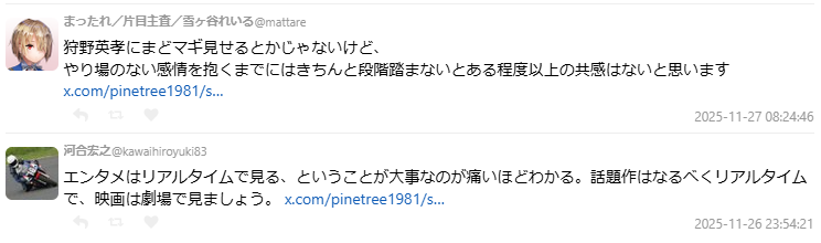 有網友舉例,把看《魔法少女小圓》結局的反應拿給沒看前面的人看,一樣不會直接感動或崩潰——情緒堆疊才是衝擊的來源,或許把前面的24集他們看過才能累積情緒到後頭,要不然那個衝擊很難共鳴。