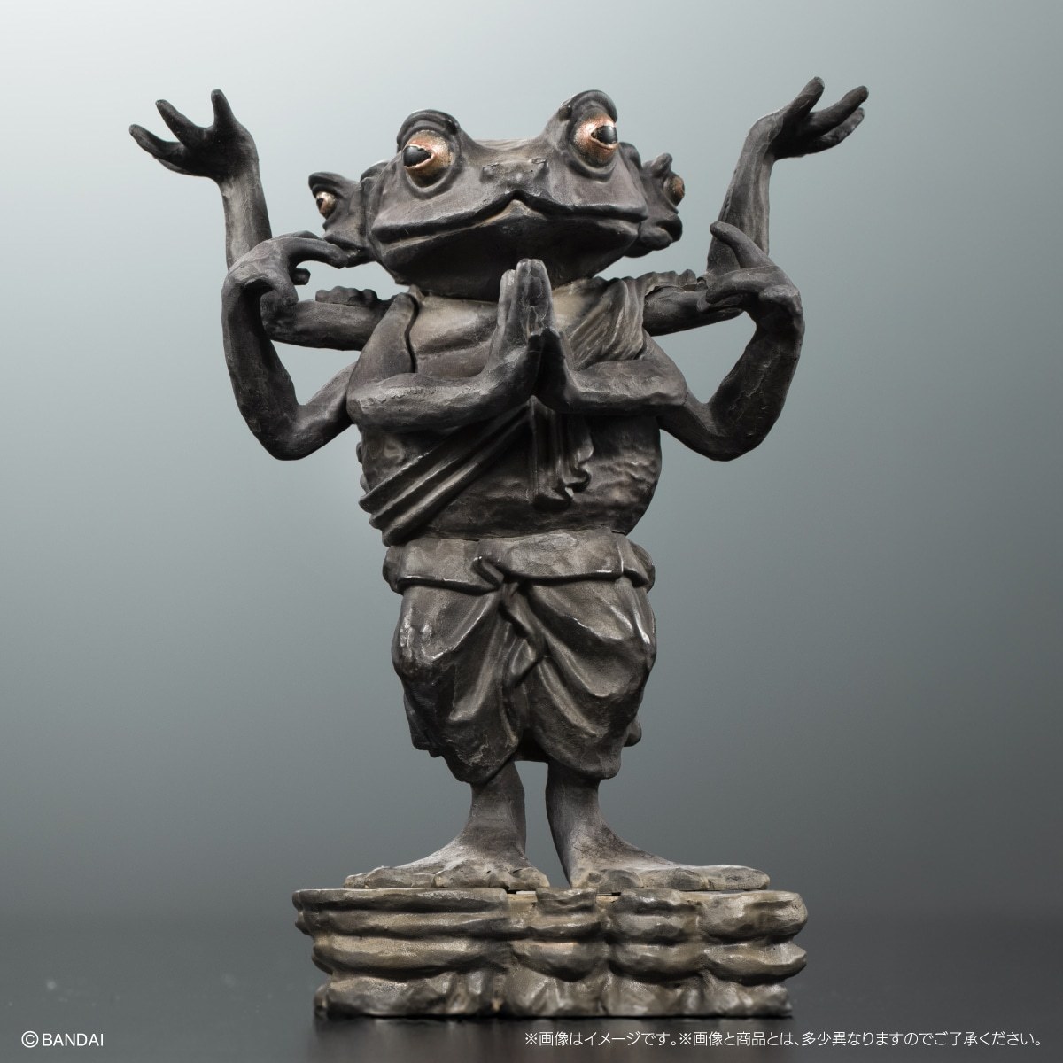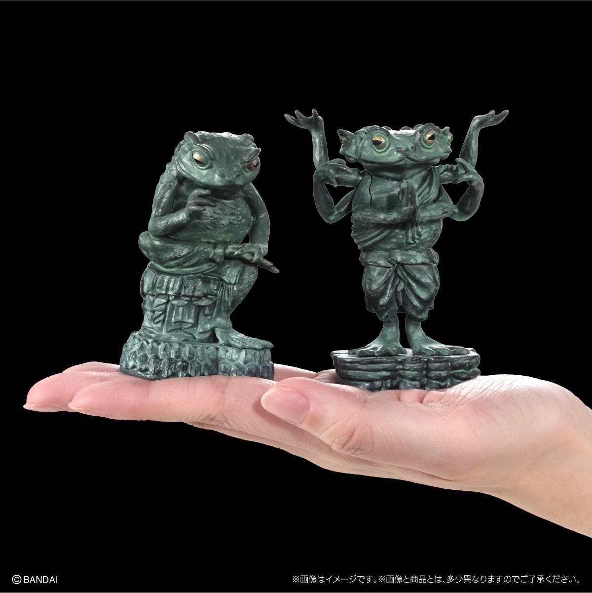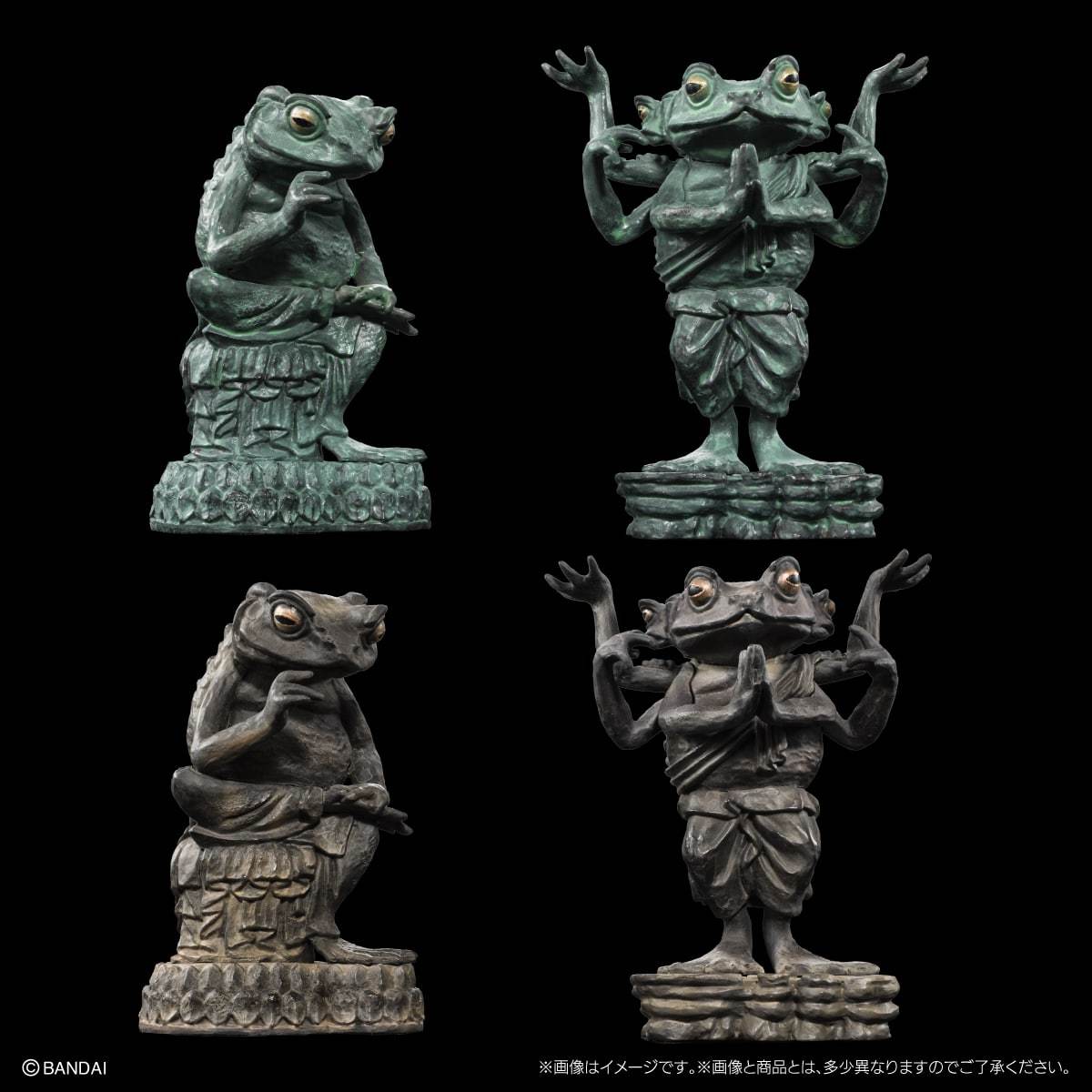 將寫實的青蛙軀體與傳統神像作出毫無違和感的趣味結合、展現出精密造型魅力與異色莊嚴感的青蛙神像,這次輪到「彌勒菩薩像」與「阿修羅像」!本作高約 8、9 公分,青蛙彌勒菩薩像展現出半跏思惟像左足支地、右腿盤起,並以右手支頤的造型,散發出一股安定思索的平靜氛圍;青蛙阿修羅像則考究再現了三面六臂的樣貌,在視覺上自然而然傳達出莊嚴與威嚴。按照慣例,這次的青蛙彌勒菩薩像與阿修羅像也同步推出了銅像配色與木像配色。
