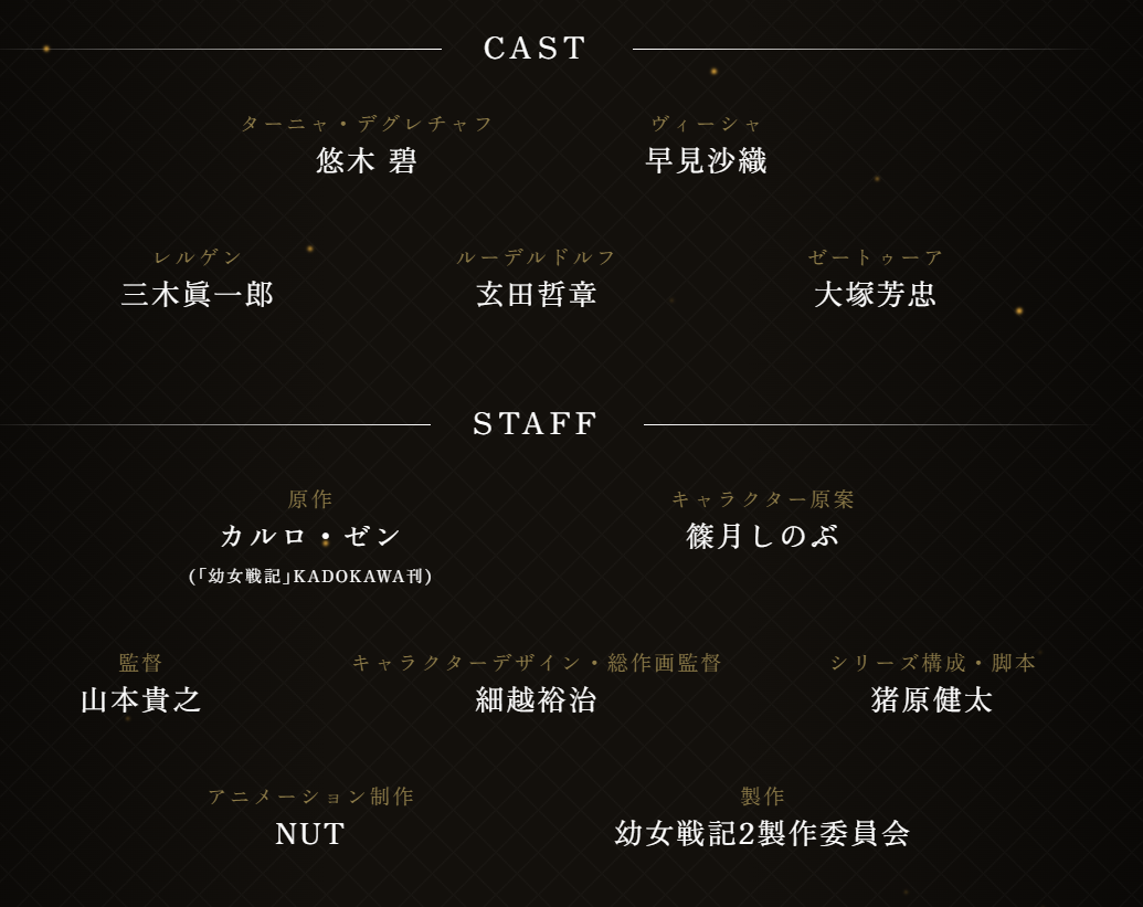 同時第一季配音的聲優也都將回歸本作,動畫製作也跟第一季一樣由NUT負責,細越裕治也同樣擔綱人物設定,基本上了除了導演外都是原班人馬。