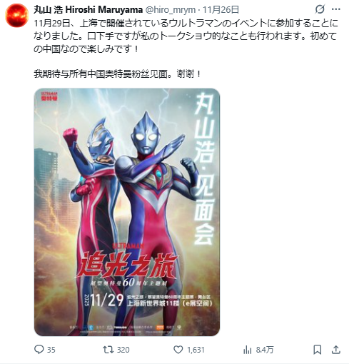 另外,原本要在上海開辦的超人力霸王60周年主題展,邀請了超人力霸王設計師丸山浩見面會,也瞬間取消讓許多粉絲大嘆扼腕。