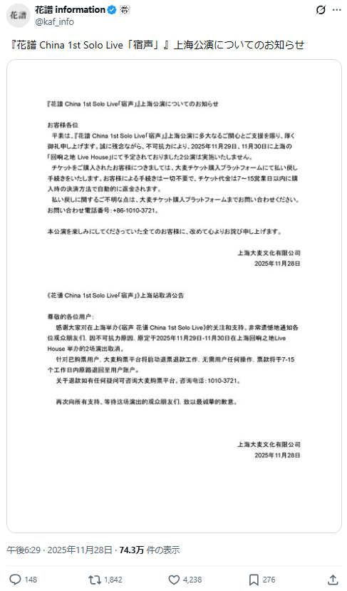 以及日本歌手花譜原訂在11月29日與30日在上海舉辦的『花譜China 1st Solo Live「宿声」』演唱會因不可抗力,只能取消並退款給原本購票的粉絲。