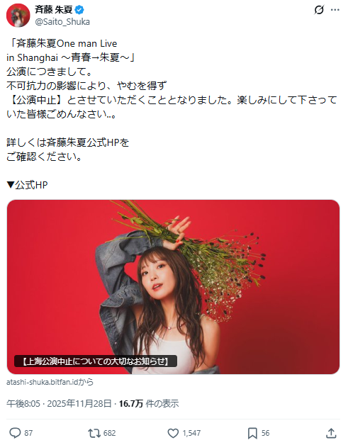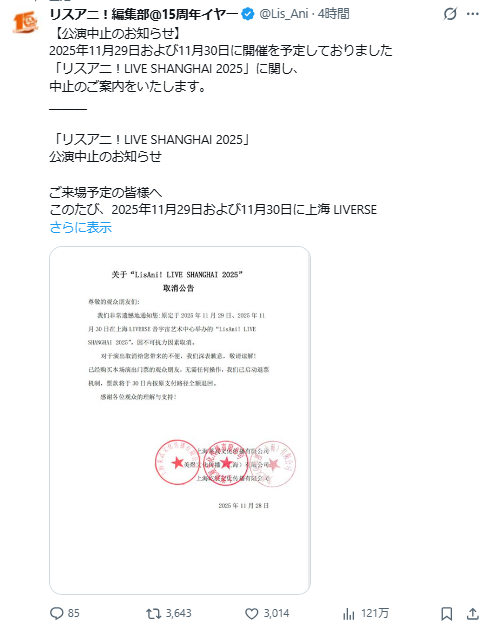 以及在上海舉辦的動漫音樂會「LisAni! LIVE SHANGHAI 2025」,也在活動前一天宣布取消演出。