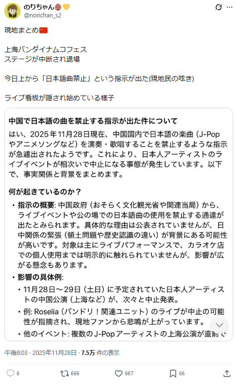 據在上海當地的日本網友指出,據說現在中國下令禁止任何日文歌曲的表演,甚至連中國演出者也不行。被中止和取消的演唱會都是因為中日兩國近期的緊張情勢,已經開始將演唱會的看板都收起來了。甚至原定萬代南夢宮嘉年華原定活動到30日,目前預計會全部取消。
