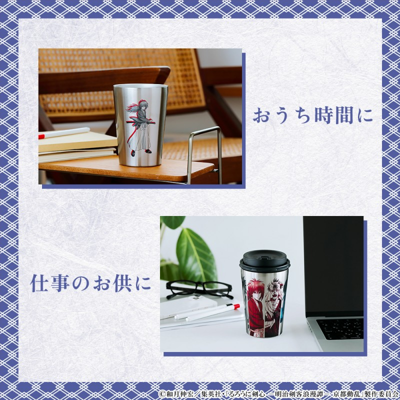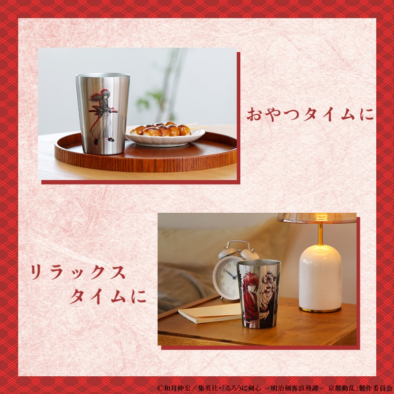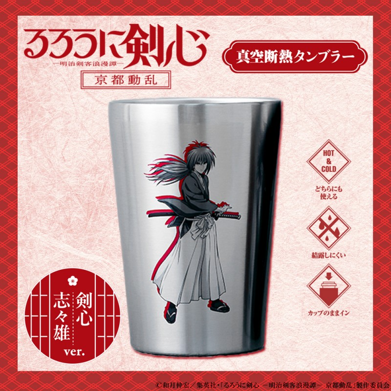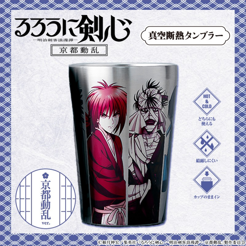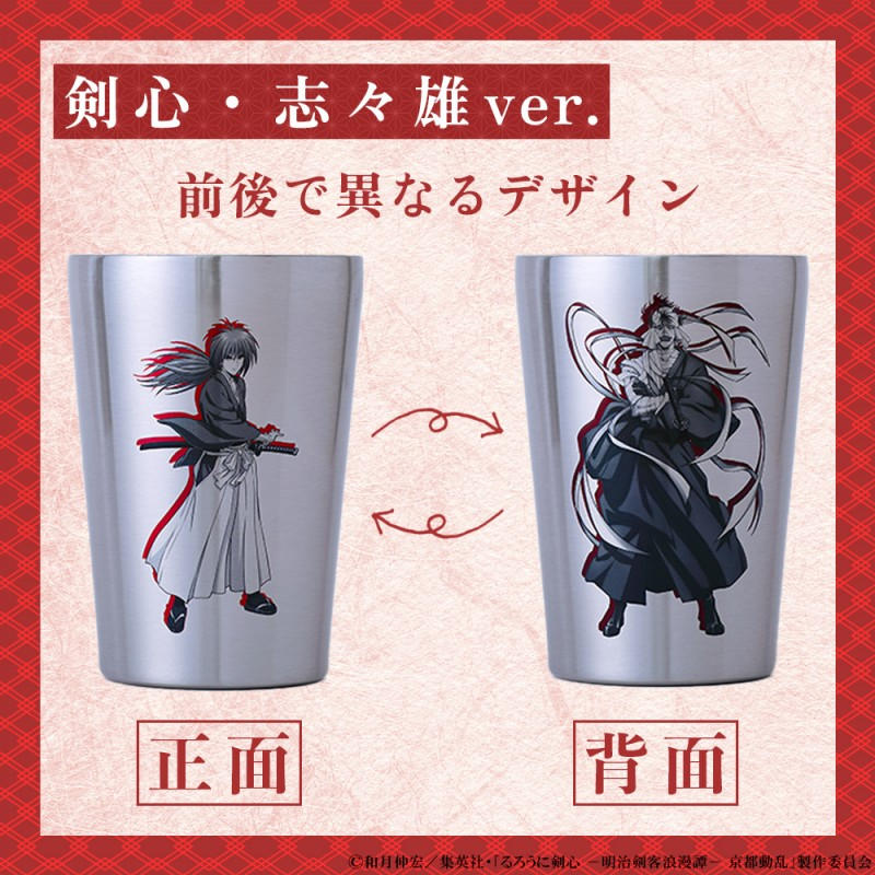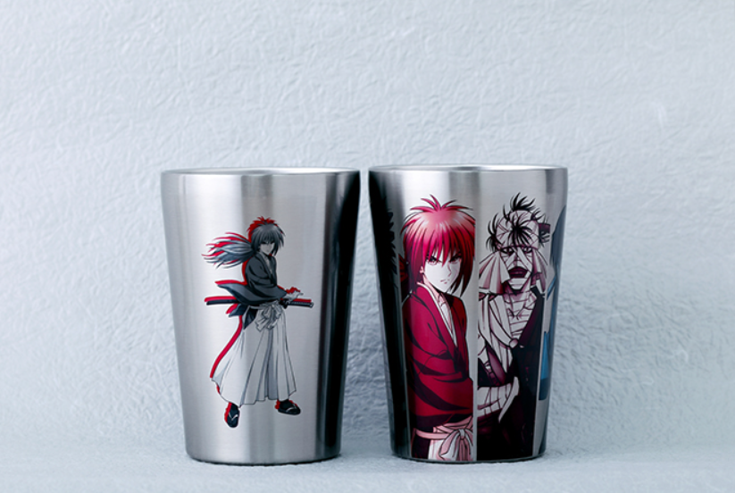以京都動亂篇為主題,將六位角色——緋村劍心、相樂左之助、齋藤一、志志雄真實、瀨田宗次郎、四乃森蒼紫——環繞 360 度印滿整個杯身。銀色底搭配角色色彩,效果超醒目超帥。