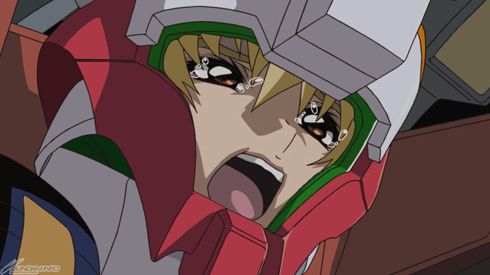 這句話在故事最後,因為混戰中與阿斯蘭一同入侵雅金·杜威要塞,也目睹了阿斯蘭之父派屈克·薩拉之死。最後她哭著喊出這句話把原本準備和正義鋼彈一起自爆以破壞創世紀的阿斯蘭拉回來,讓兩人成功逃脫。
