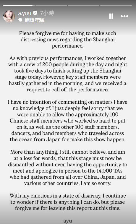 「我沒有立場對自己不了解的領域妄加評論,但僅僅是想到為了濱崎步舞台全力付出的近100名中國工作人員、以及從日本跨海而來的約100名工作人員、舞者、樂手們無法讓他們登上正式舞台,我深感抱歉。」