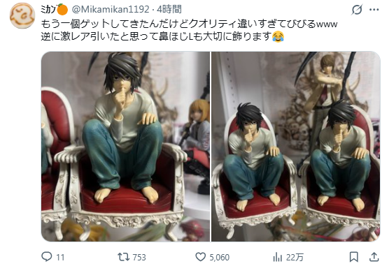 近日日本有推主分享,他抽了『一番賞 死亡筆記本 DEATH NOTE』拿到最後賞的「L」角色模型,卻發現這隻怪怪的,一看才知道買到「邪神L」,招牌的咬手指居然變成挖鼻孔,分享在X上後也成為話題。