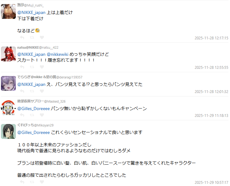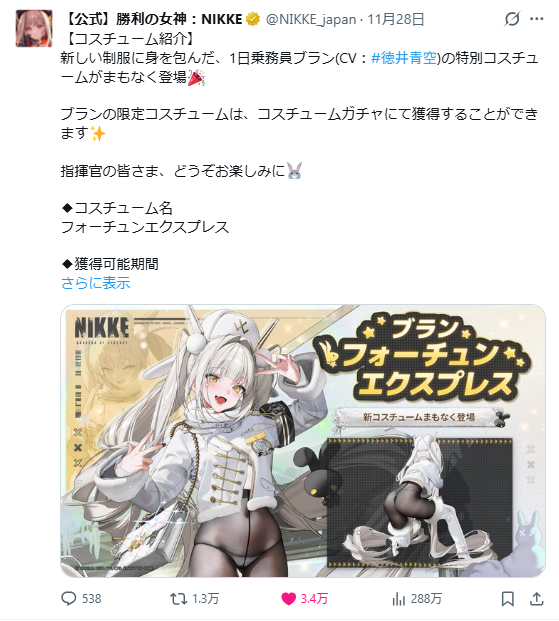 NIKKE 官方於 11 月 28 日在 X發布布蘭兒的限定時裝宣傳貼文,這個造型雖說是要課金才有機會拿到的,不過這樣的造型也引起正反意見與部分玩家困惑。