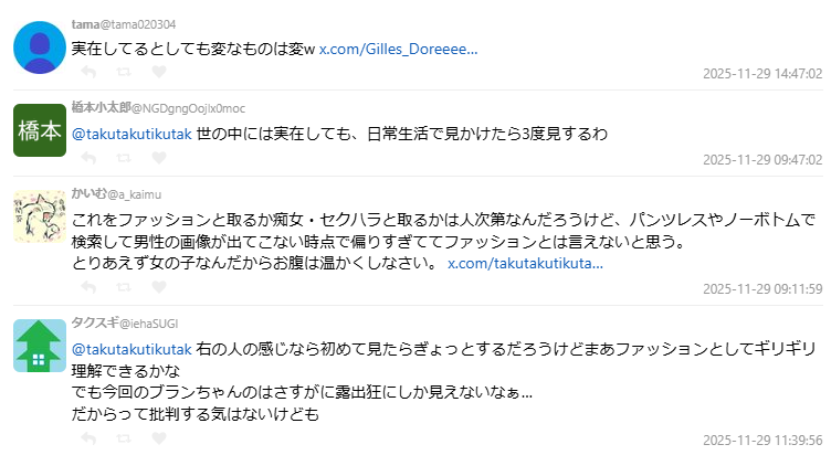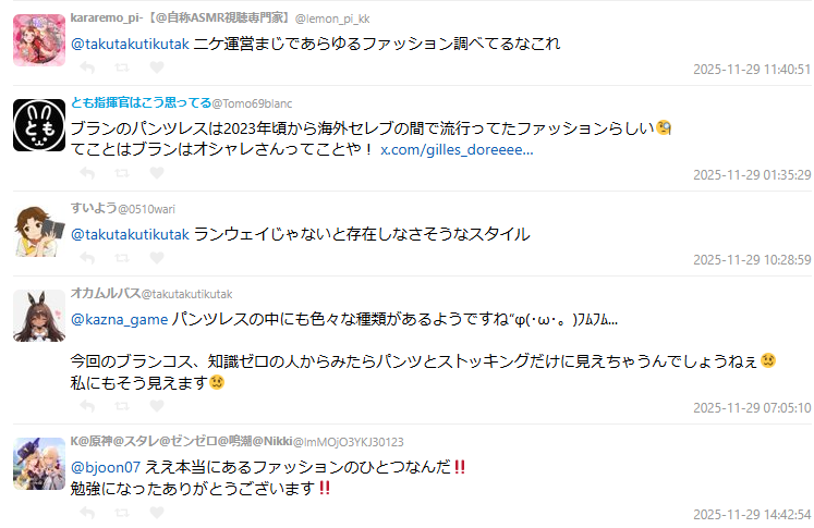 面對玩家熱烈討論,多位網友貼出現實案例指出,布蘭兒的新服裝實際上屬於近年流行的「無褲時尚(pantsless fashion)」穿搭,亦稱「No-bottom look」,布蘭兒的繪師minDORE(@Gilles_Doreeee)也向日本網友解釋,是真的有這樣的時尚風格。