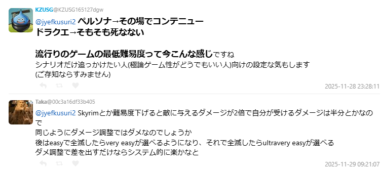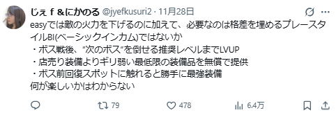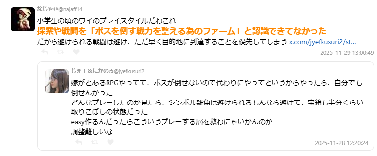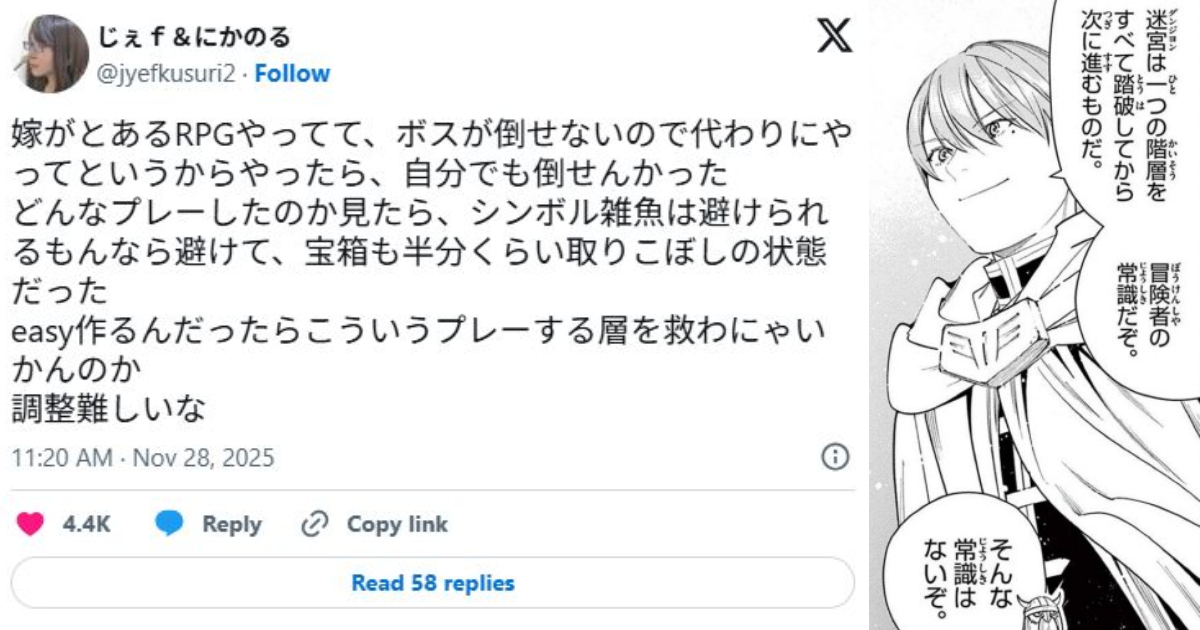 日本 X上近日出有位推主分享,自己太太玩某款RPG遊戲時,因為「能避的雜魚都避掉、寶箱也漏了一半」,結果遊戲卡在打不贏 Boss。自己被請去「代打」後,自己也同樣慘敗,讓他忍不住思考:「如果要做 easy 模式,是不是得拯救這種玩法的玩家?」,這篇貼文引也發許多遊戲玩家共鳴的討論。