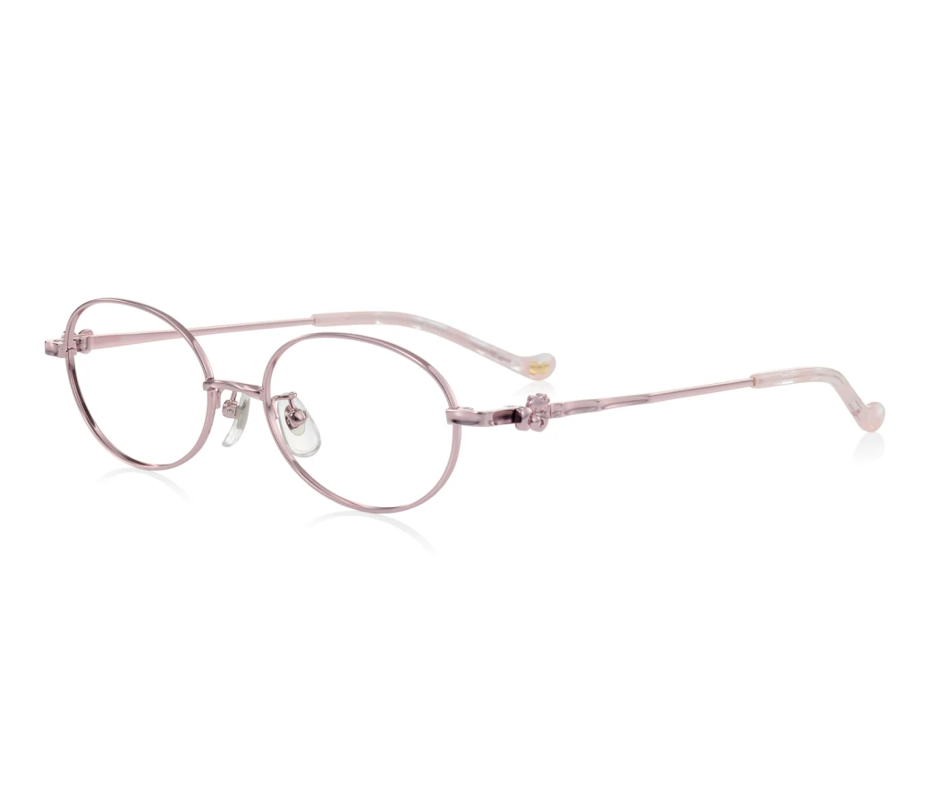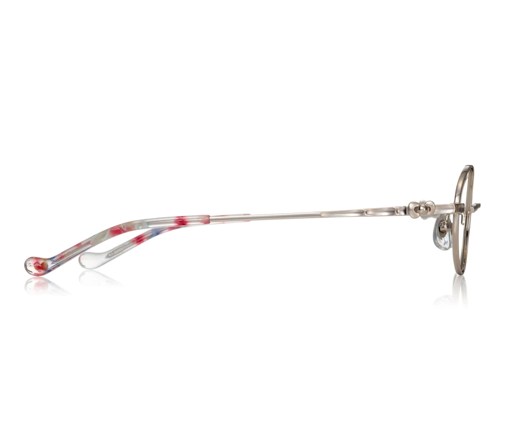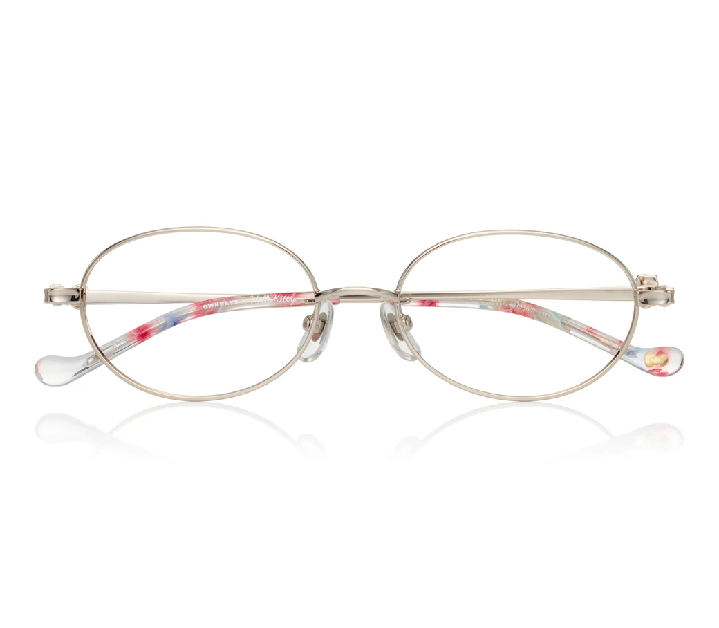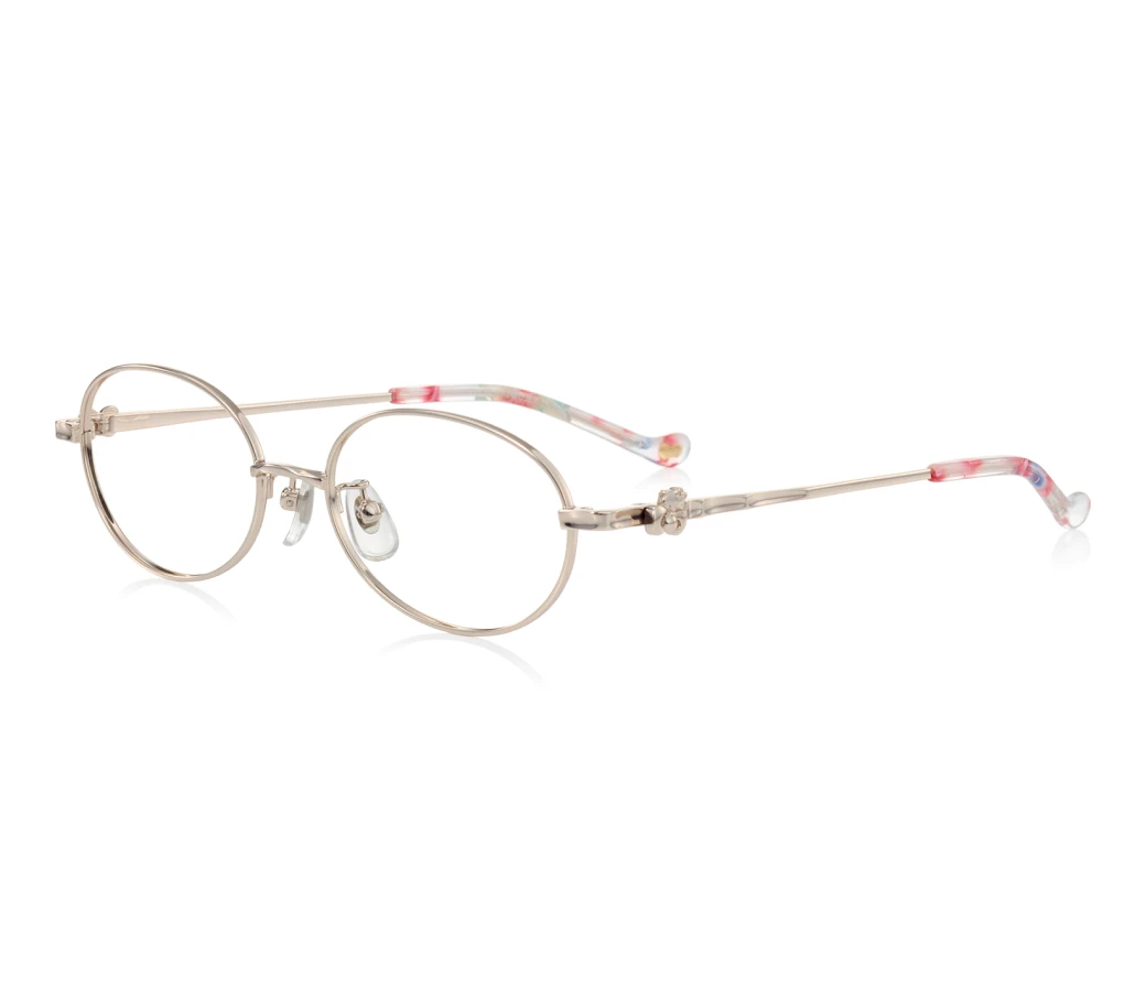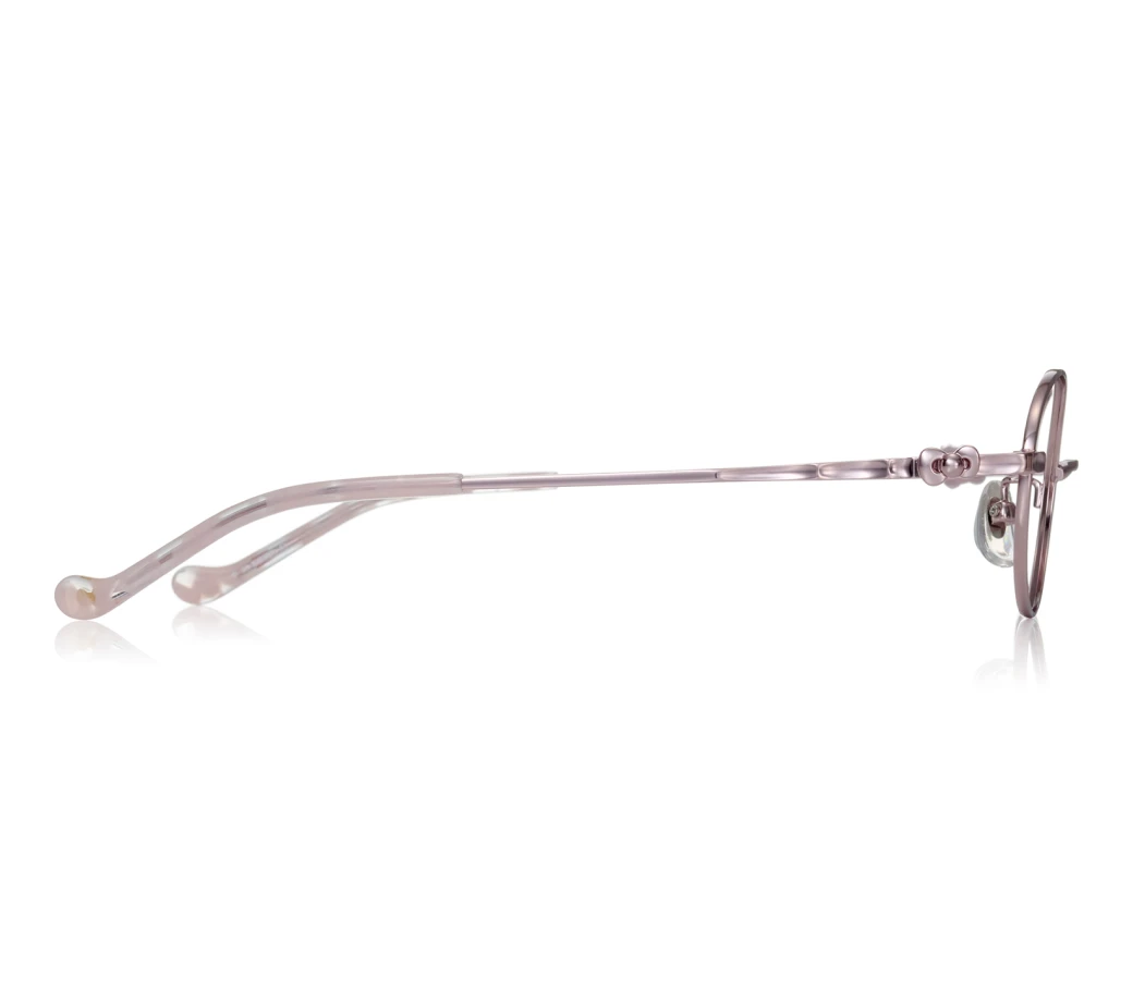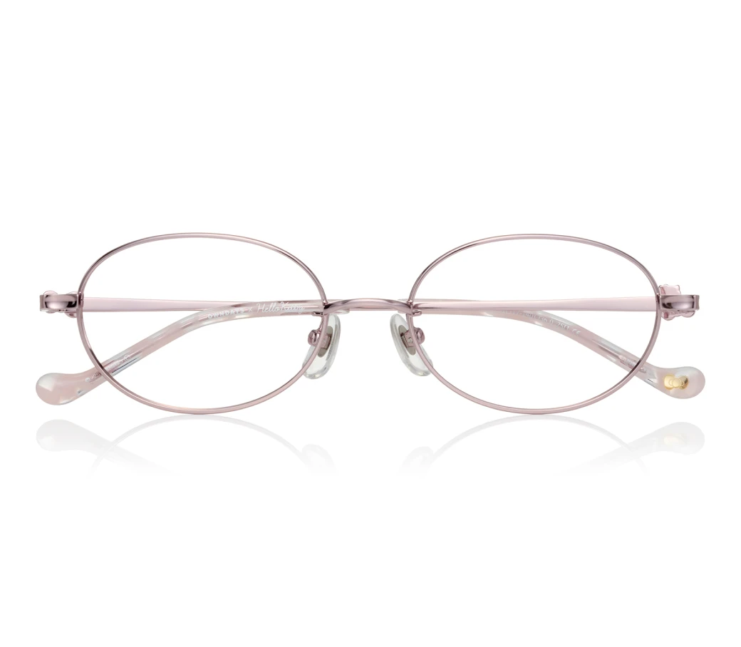 「蝴蝶結 model」是帶點小女人味的橢圓框眼鏡,金屬材質本身就很有光澤感,兩側鏡腳都做了立體蝴蝶結裝飾,左邊甚至還有 Hello Kitty 從蝴蝶結後面探頭的可愛小巧思。戴上去整個氣質提升,日常心情瞬間變甜。