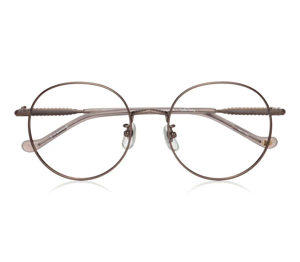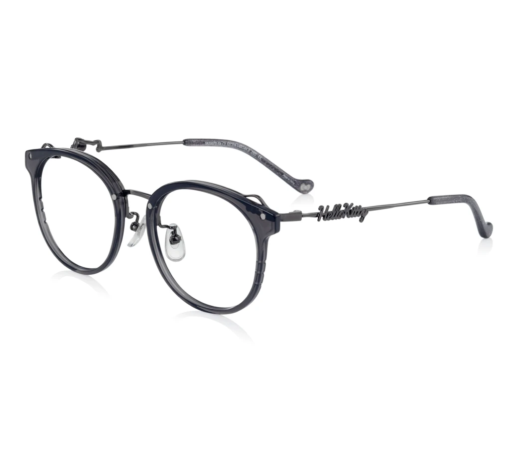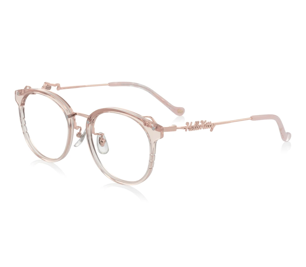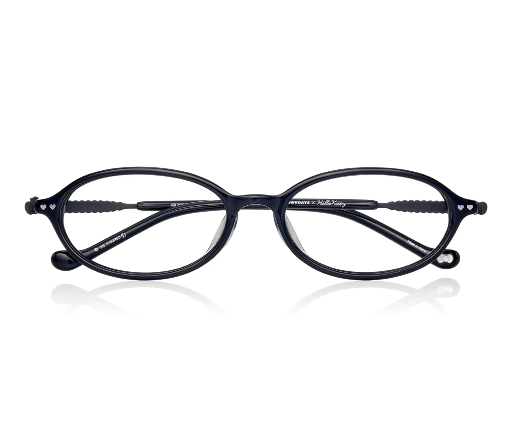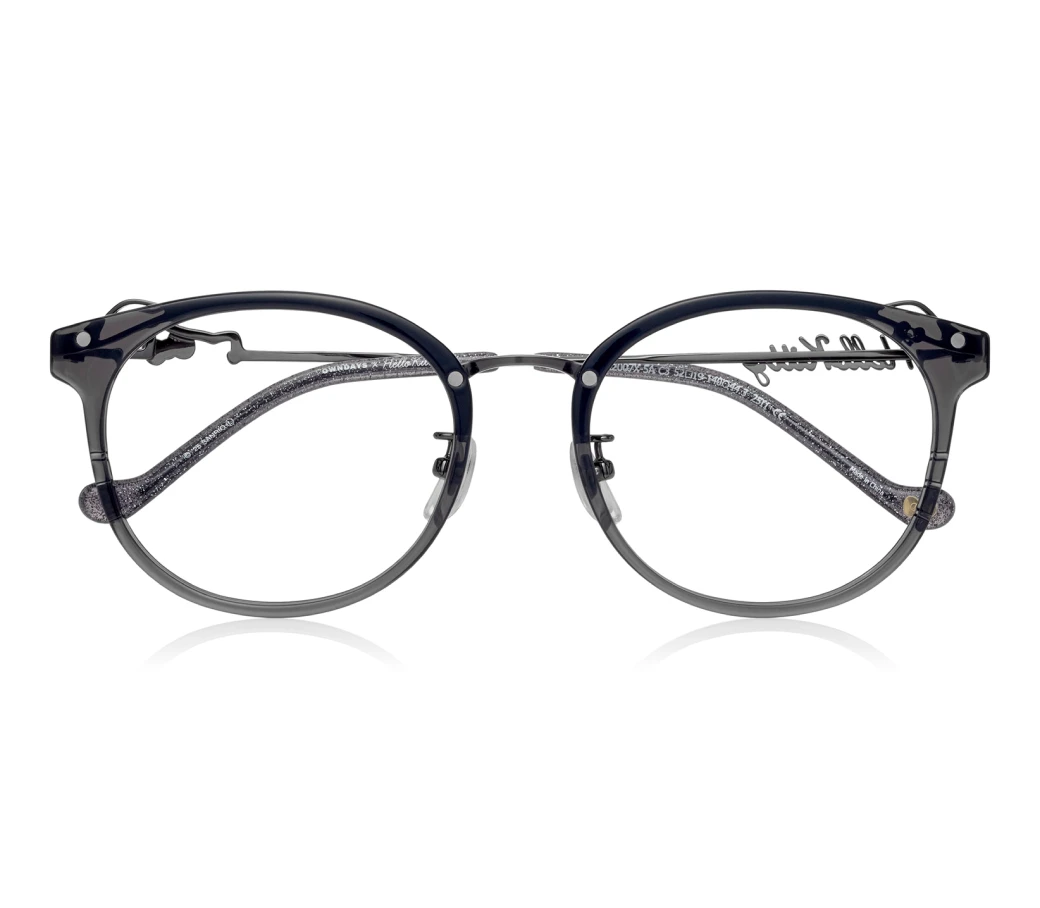 這款直接把「Hello Kitty 的臉」融入設計,是可愛到無法反抗的威靈頓框。從正面看得到貓耳朵跟蝴蝶結的造型線條,兩側還做了鬍鬚的立體刻紋。鏡腳左邊是 “Hello Kitty” 字樣,右邊則是 Kitty 的剪影。