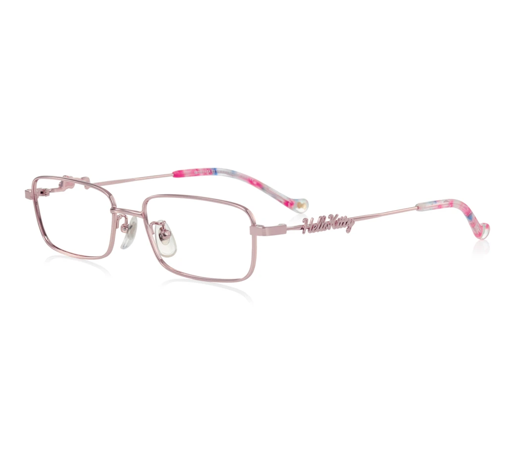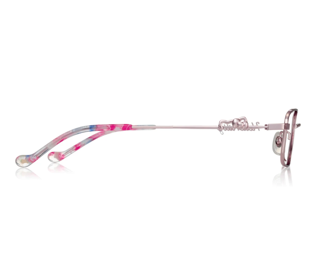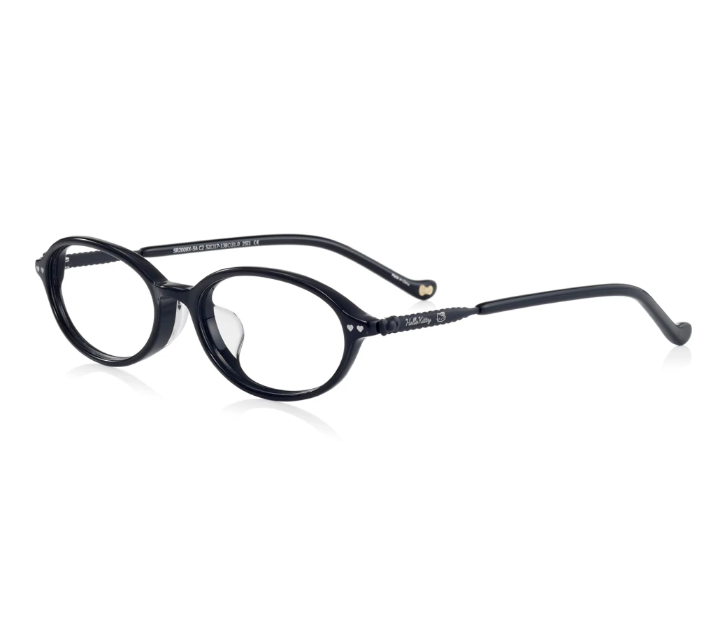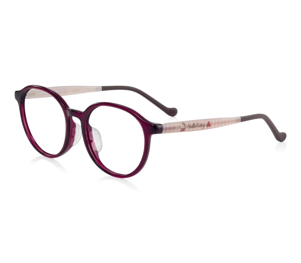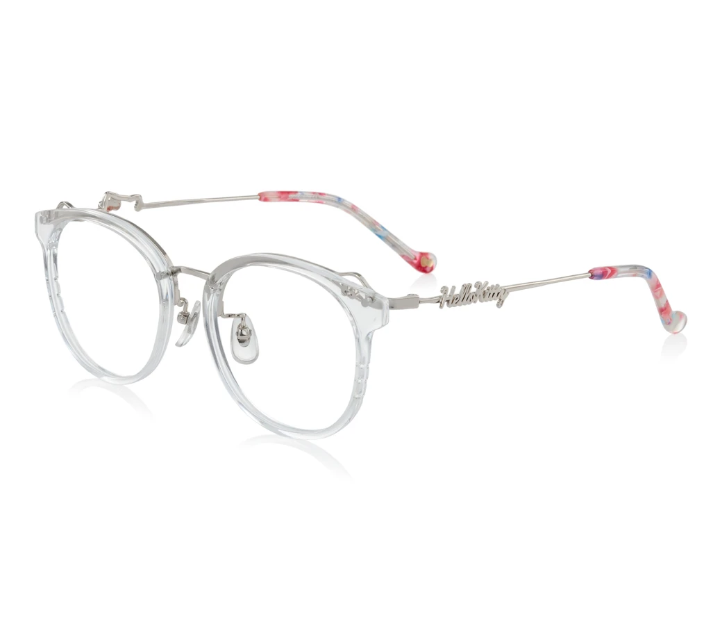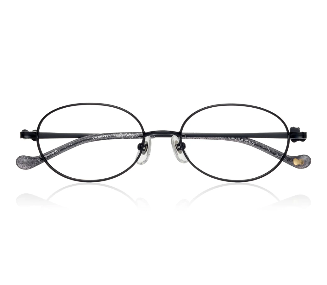 這款直接把「Hello Kitty 的臉」融入設計,是可愛到無法反抗的威靈頓框。從正面看得到貓耳朵跟蝴蝶結的造型線條,兩側還做了鬍鬚的立體刻紋。鏡腳左邊是 “Hello Kitty” 字樣,右邊則是 Kitty 的剪影。