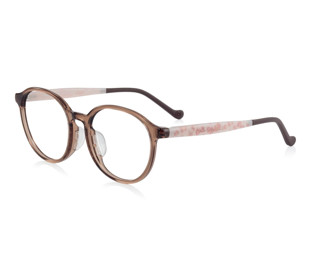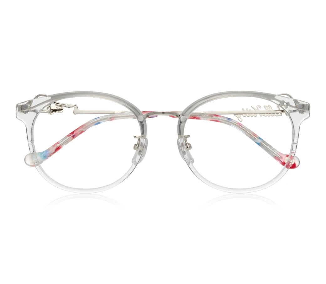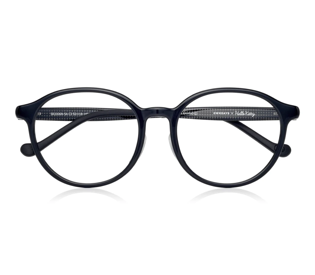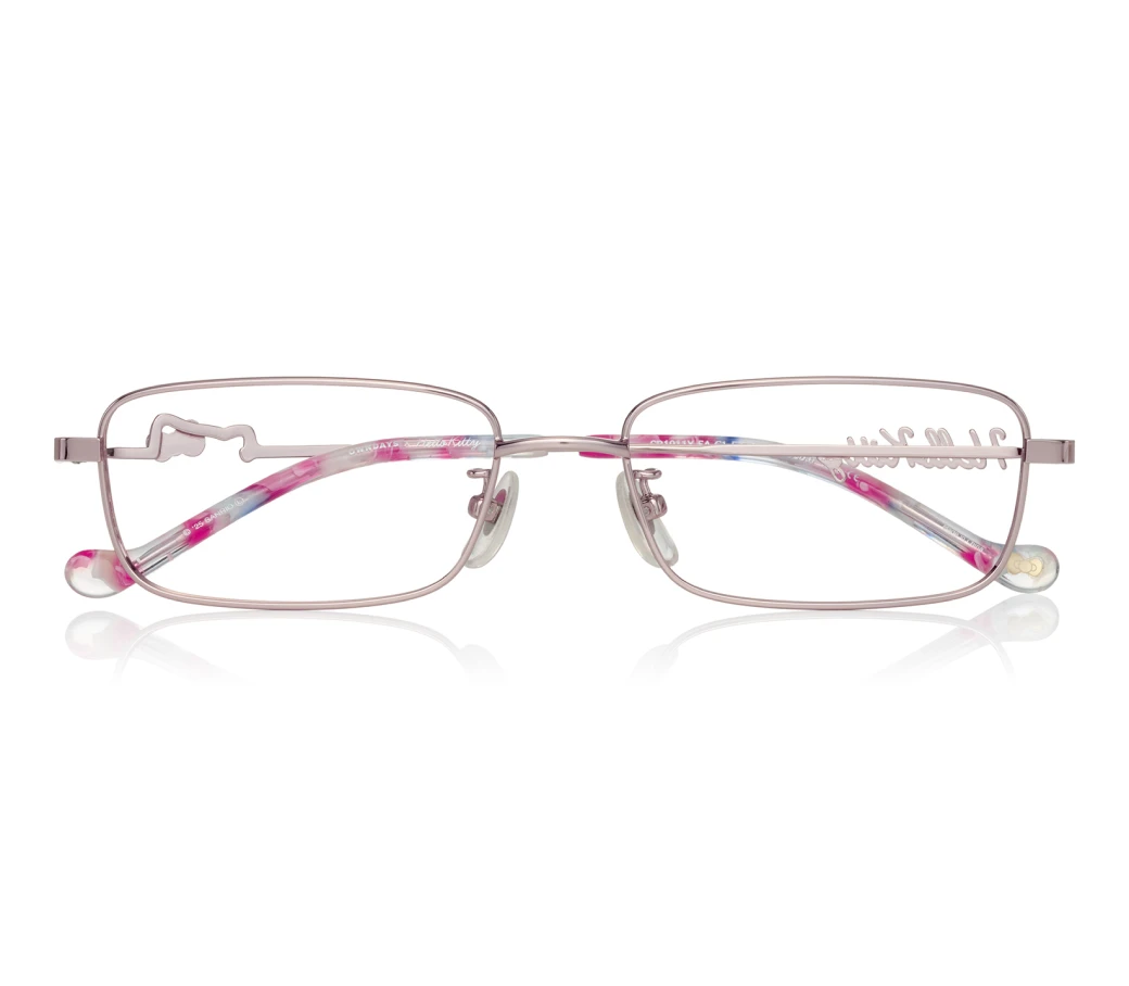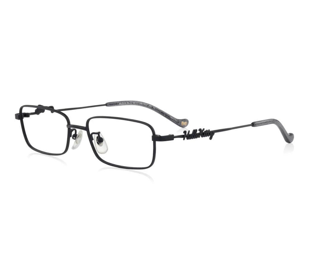 這款直接把「Hello Kitty 的臉」融入設計,是可愛到無法反抗的威靈頓框。從正面看得到貓耳朵跟蝴蝶結的造型線條,兩側還做了鬍鬚的立體刻紋。鏡腳左邊是 “Hello Kitty” 字樣,右邊則是 Kitty 的剪影。