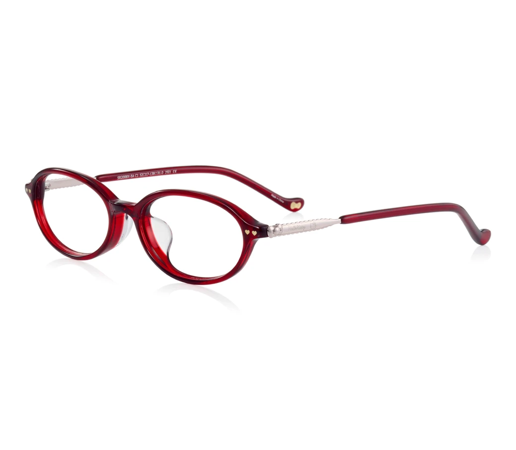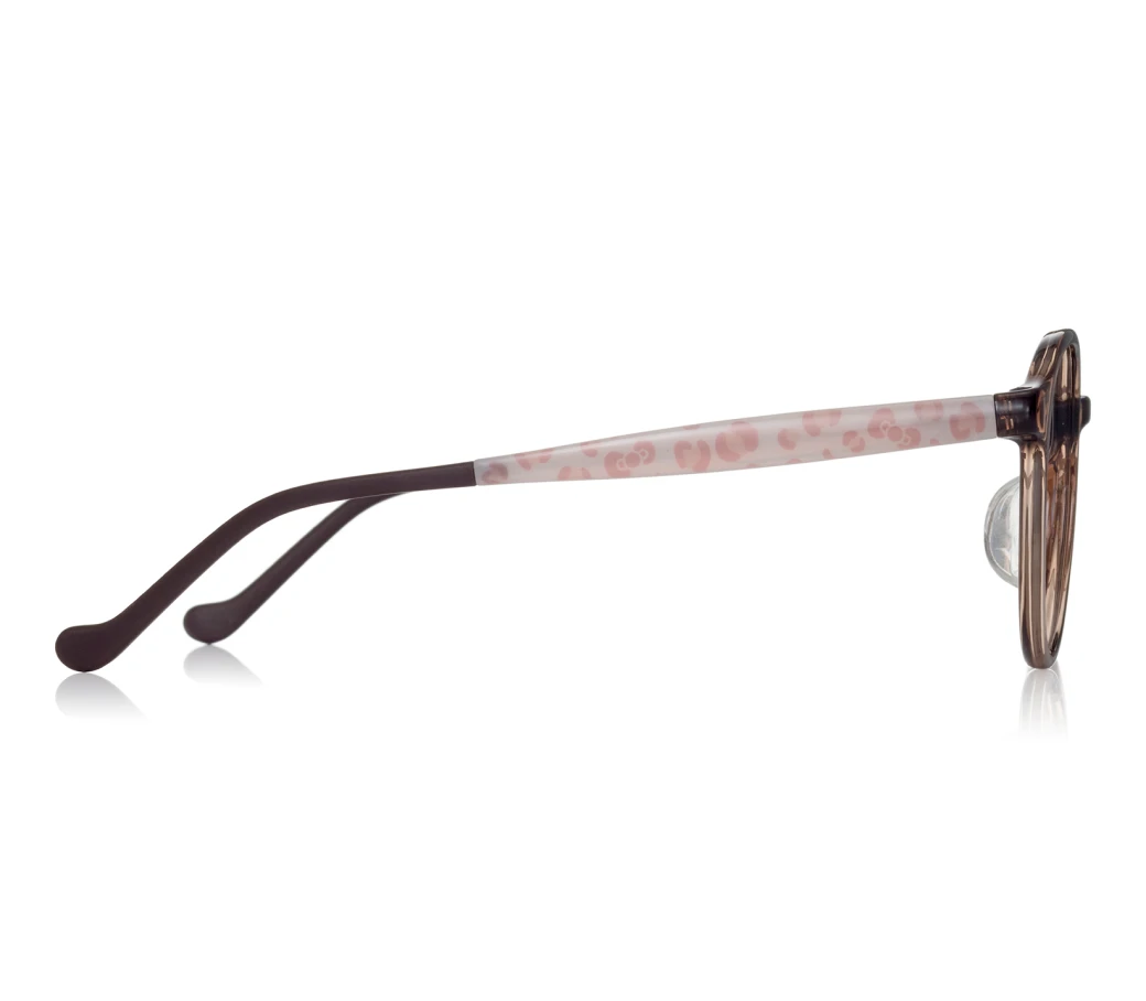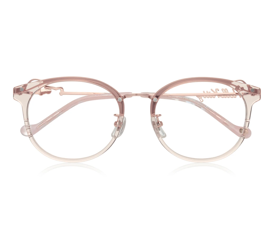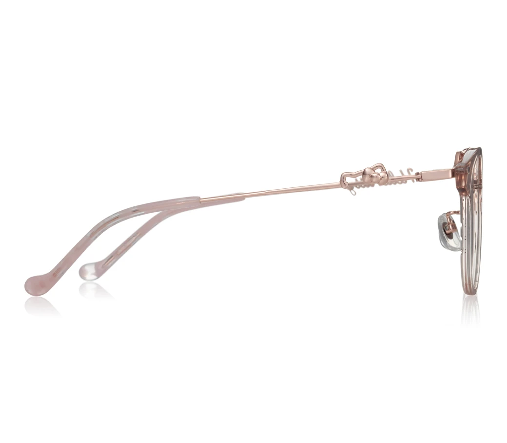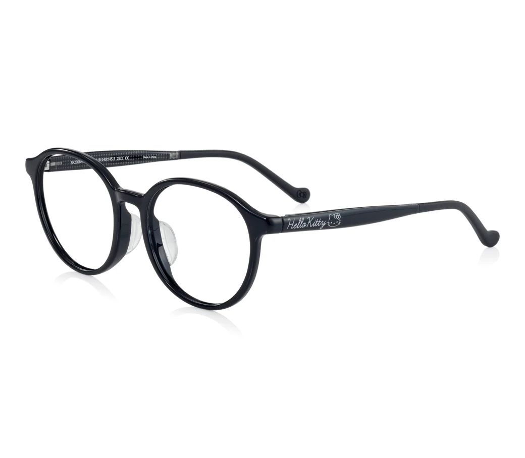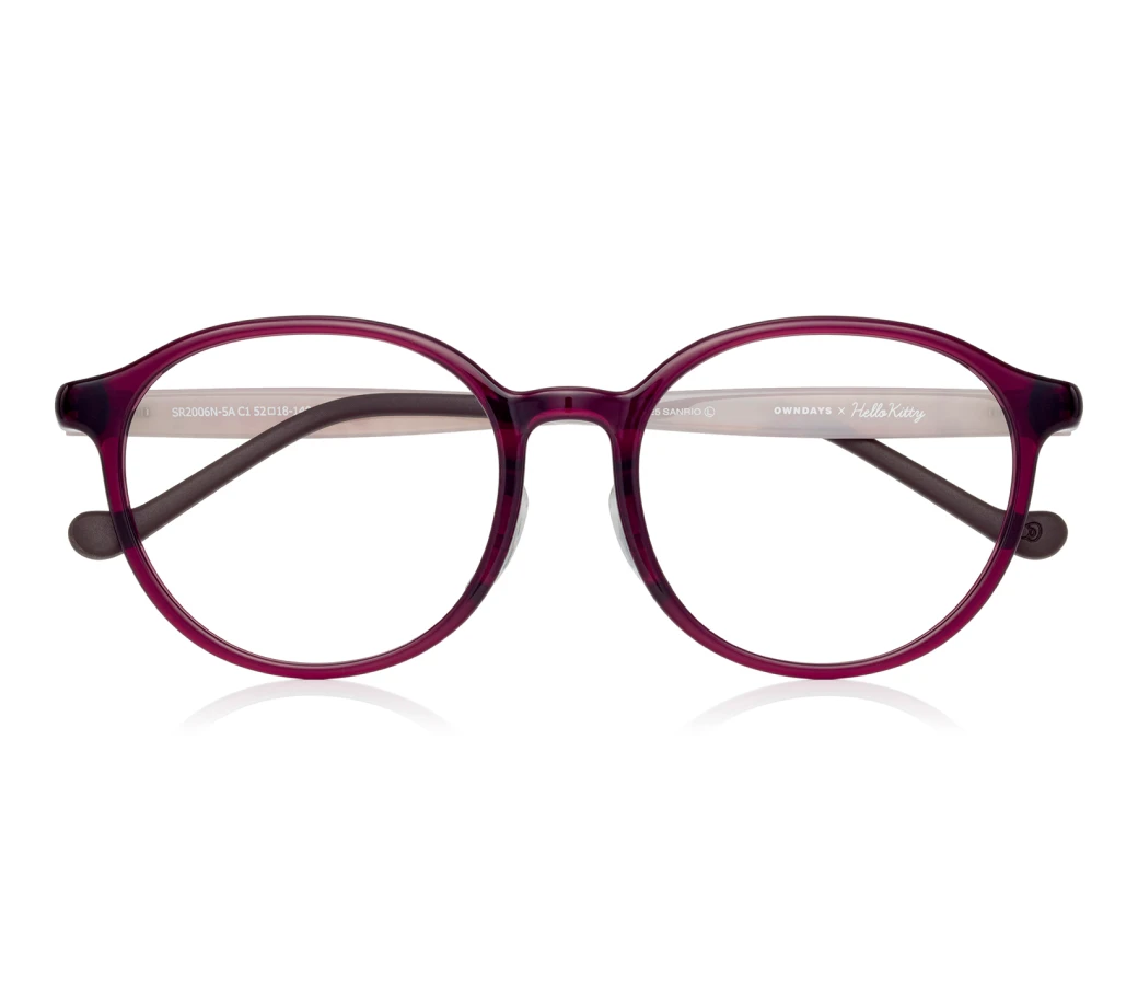 這款直接把「Hello Kitty 的臉」融入設計,是可愛到無法反抗的威靈頓框。從正面看得到貓耳朵跟蝴蝶結的造型線條,兩側還做了鬍鬚的立體刻紋。鏡腳左邊是 “Hello Kitty” 字樣,右邊則是 Kitty 的剪影。