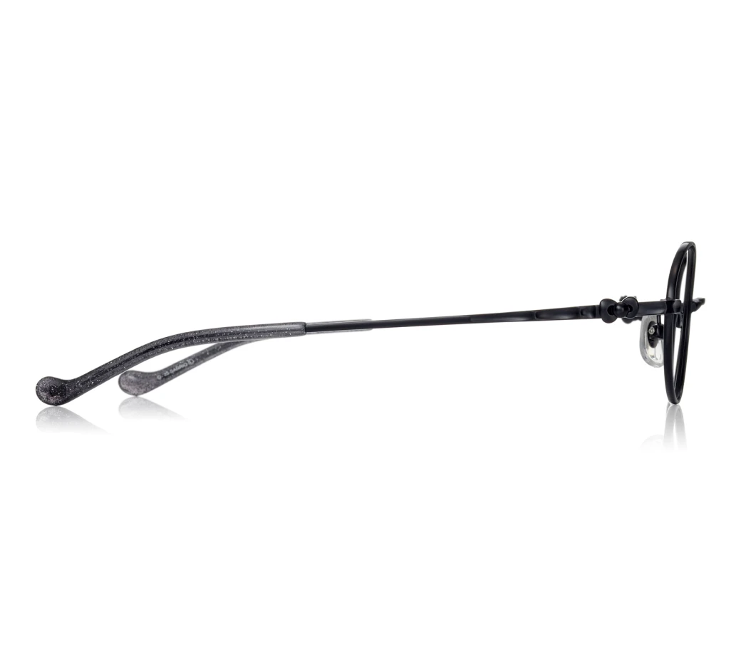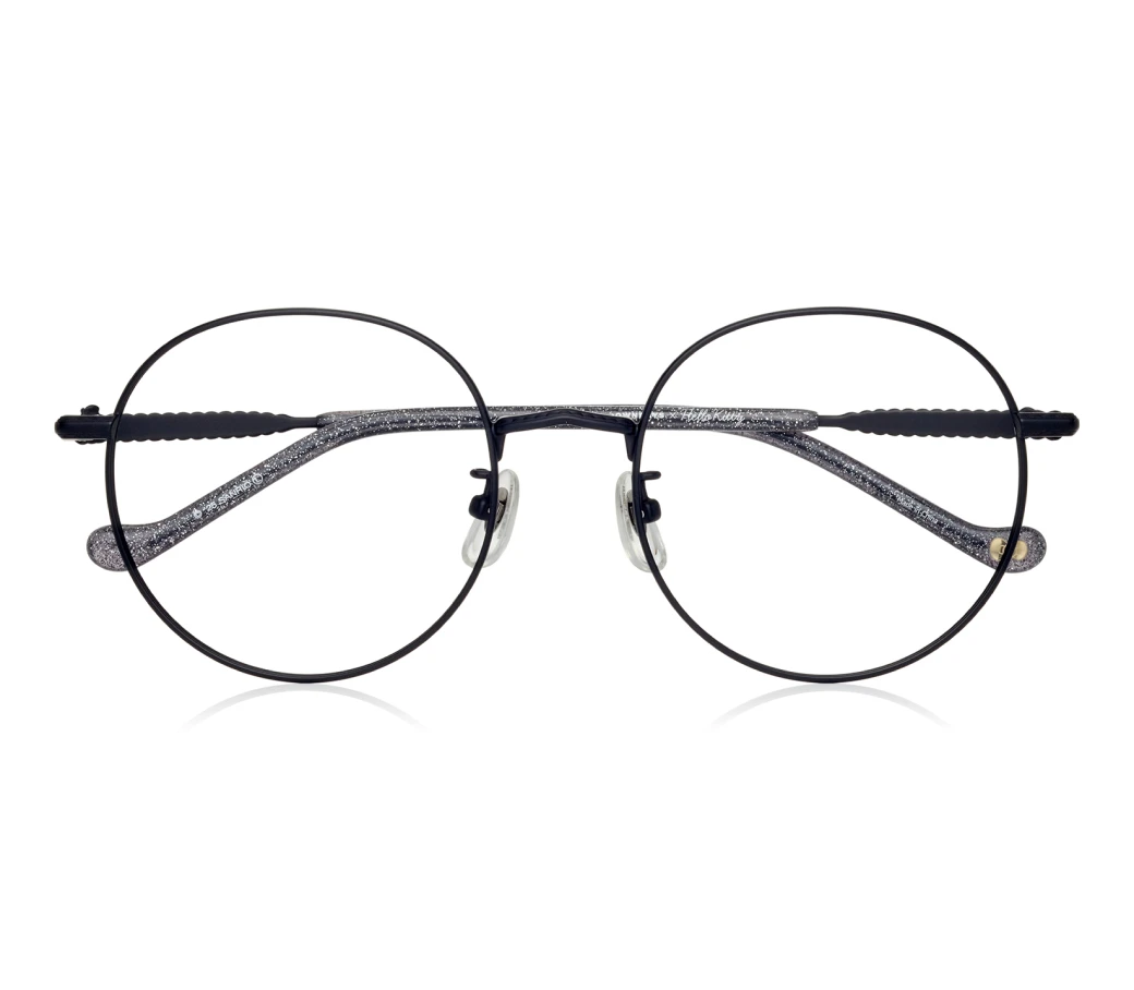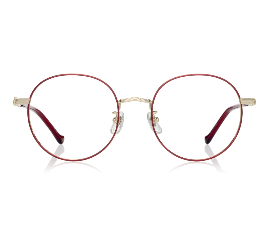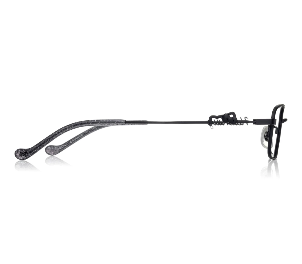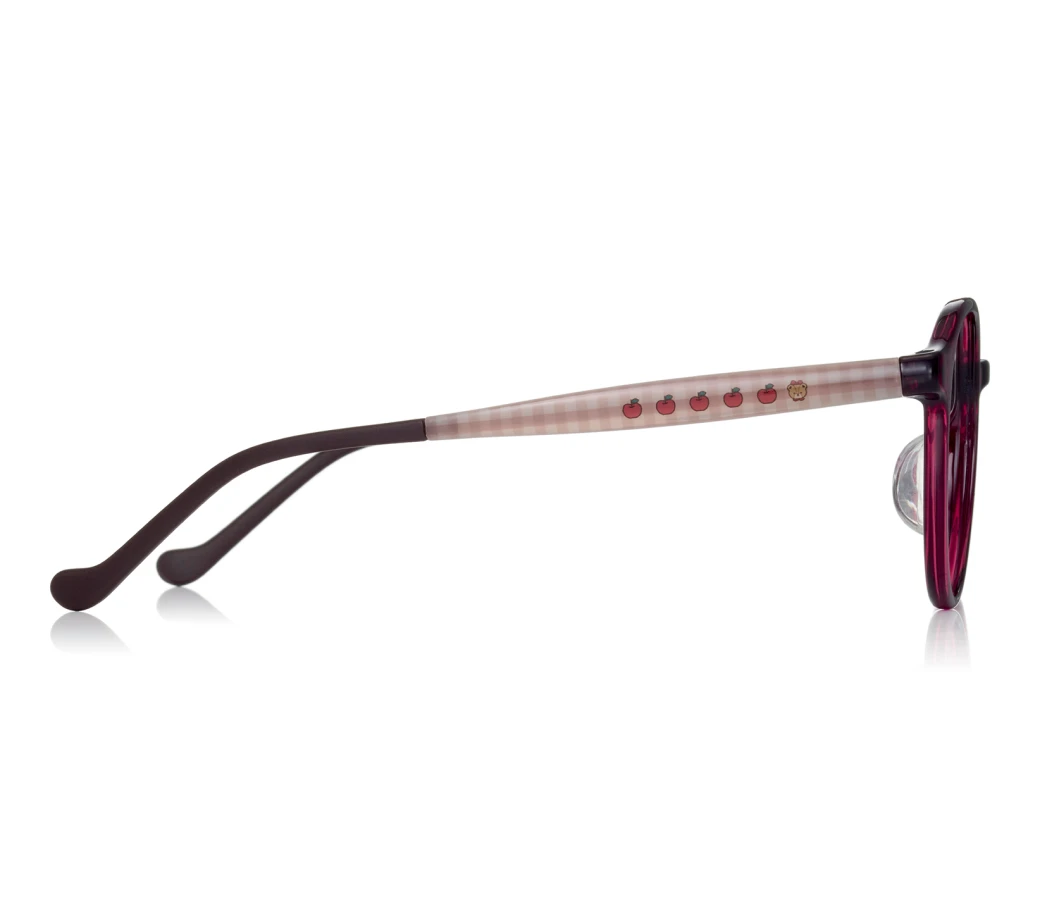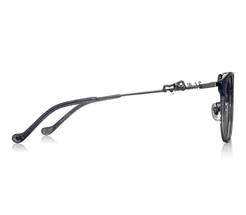 這款完全走 Y2K 千禧辣妹風,鏡框旁邊擺上小小愛心零件超吸睛。圓潤線條結合 90~2000 年代復古感,戴上去就是有點電、有點宅、有點潮的氛圍。鏡腳的蕾絲紋路加上蝴蝶結與蘋果圖案,側面看也別有懷舊韻味。