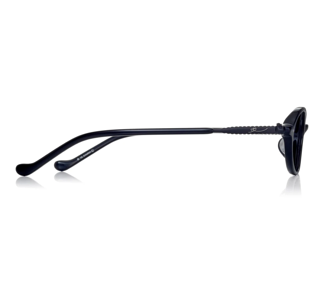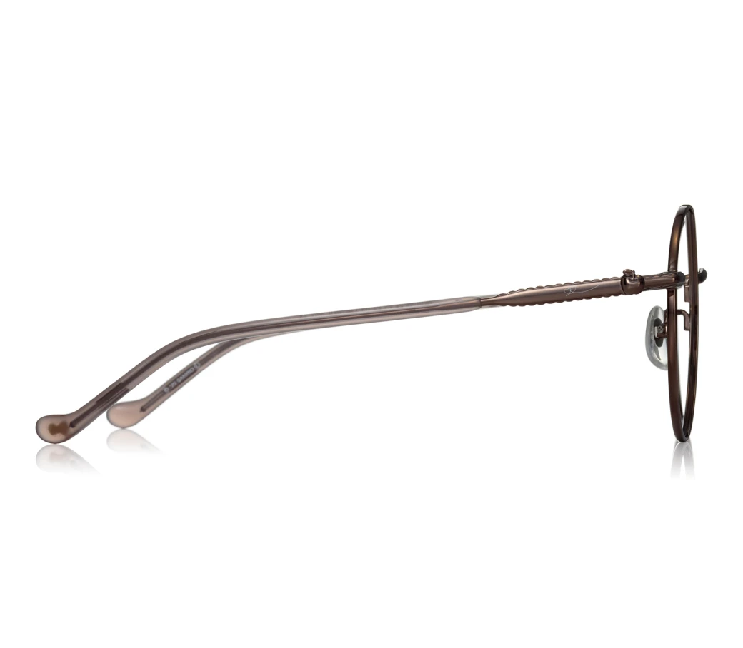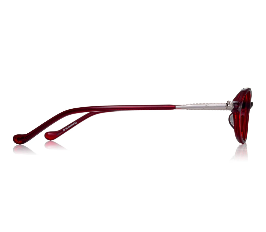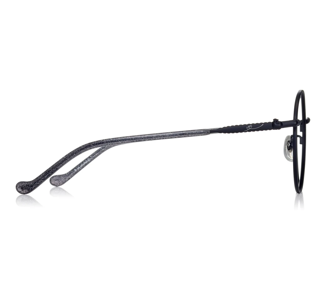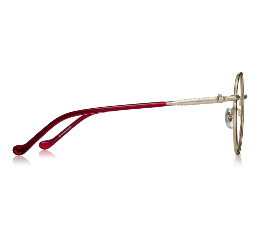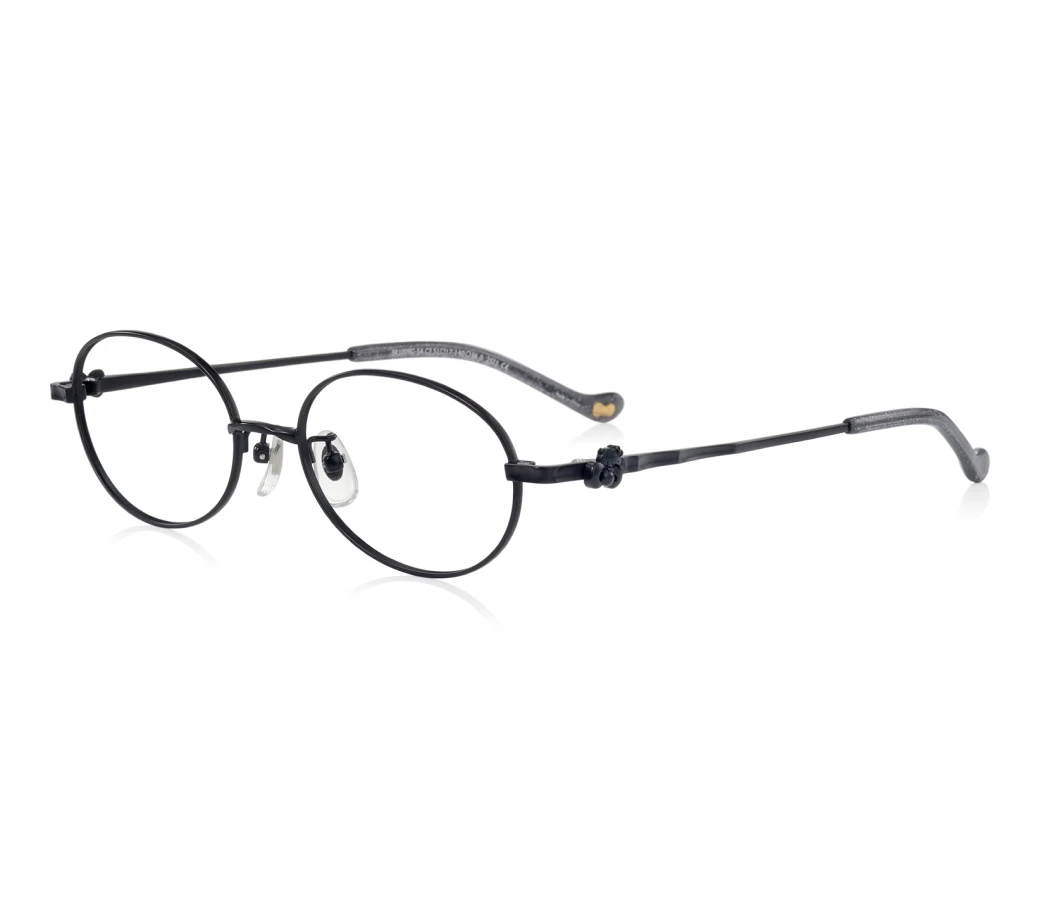 這款完全走 Y2K 千禧辣妹風,鏡框旁邊擺上小小愛心零件超吸睛。圓潤線條結合 90~2000 年代復古感,戴上去就是有點電、有點宅、有點潮的氛圍。鏡腳的蕾絲紋路加上蝴蝶結與蘋果圖案,側面看也別有懷舊韻味。