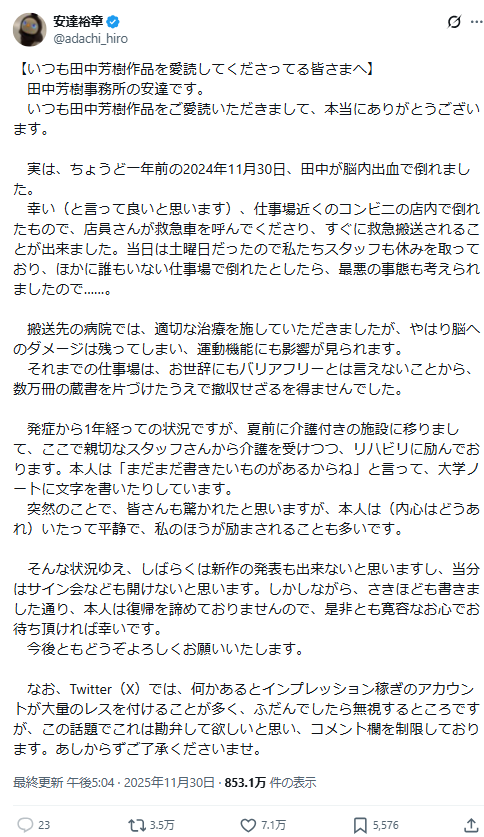 根據安達先生說明,雖然現在才跟大家報告——但在一年前的 2024 年 11 月 30 日,田中老師因為「腦溢血」突然倒下。還好(真的算是不幸中的大幸)事發地點剛好是在工作室附近的便利商店裡,店員立刻幫忙叫救護車,讓他能在第一時間被送醫急救。如果那天他是在工作室裡倒下,那裡平常只有他一個人,而且那天剛好是星期六,我們工作人員都休假……後果真的不敢想。