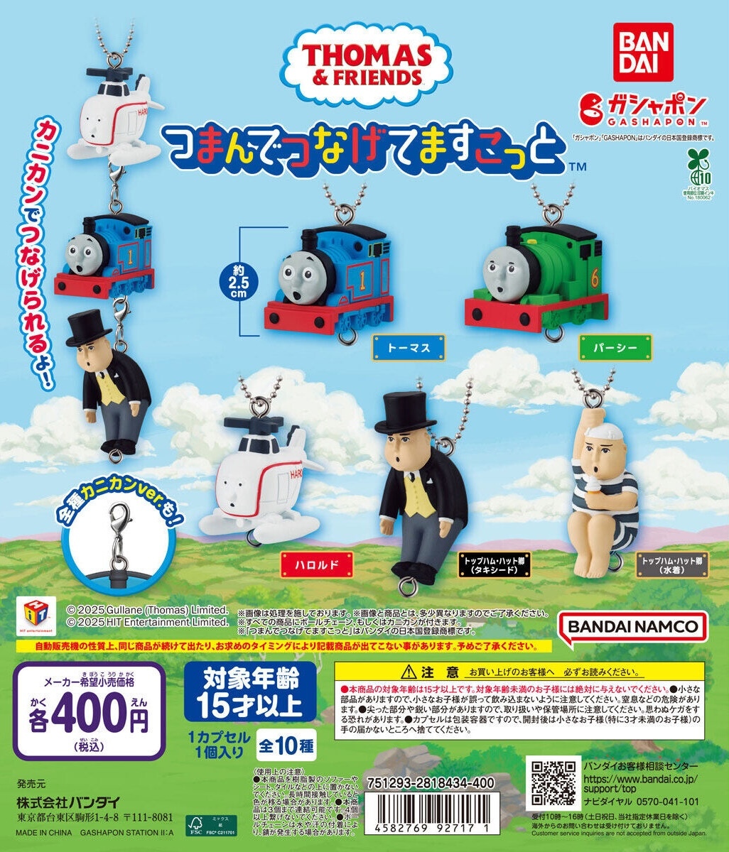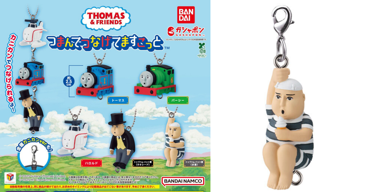 日本萬代公司轉蛋事業部 GASHAPON 將推出《湯瑪士小火車》主題的新商品——「湯瑪士小火車 垂掛人偶吊飾」轉蛋,參考售價為每轉 400 日圓,預計於 2025 年 12 月第三週開轉!
