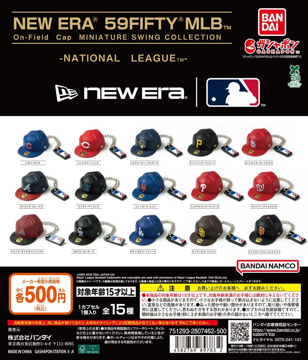 萬代公司轉蛋事業部 GASHAPON 推出與美國大聯盟官方球帽唯一的製造經銷商 NEW ERA 合作推出「NEW ERA® 59FIFTY® 實戰棒球帽吊飾收藏-國家聯盟-」轉蛋,參考售價為每轉 500 日圓,預計於 2025 年 12 月第四週開轉!