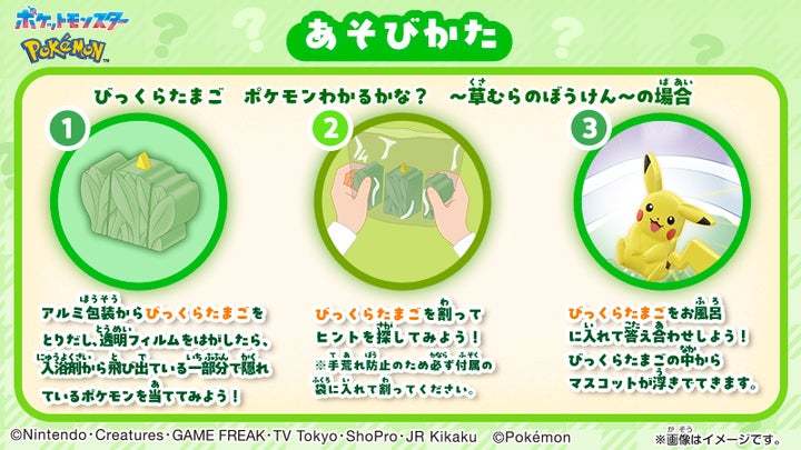 日本萬代玩具公司 LIFESTYLE 事業部旗下讓你可以「邊泡澡邊玩樂」的入浴劑型玩具商品「驚奇蛋」(びっくらたまご)系列日前發表了寶可夢主題的最新商品「猜得到是什麼寶可夢嗎?~草叢大冒險~」(暫譯,ポケモンわかるかな? ~草むらのぼうけん~)!預計 2026 年 1 月 22 日開始發售,建議售價為每款 550 日幣(含稅),一共有五種款式可以收集。