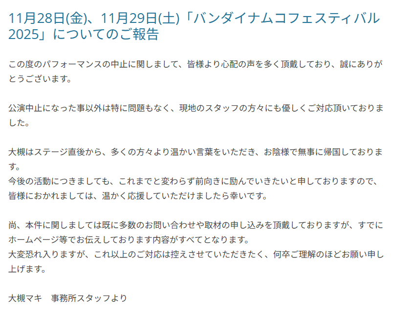 官方網站由經紀公司更新了一篇名為「關於 11 月 28、29 日『萬代南夢宮嘉年華2025』的說明」的文章。