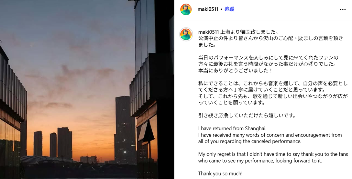 大槻真希本人也在Instagram發文,用日文和英文寫下:「我已經從上海回國了,收到大家很多關心與打氣。比較遺憾的是,沒能在當天向來看表演、期待我演出的人親自道謝。真的非常感謝大家!」