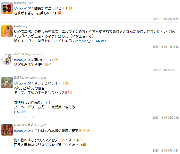 網友們看到後紛紛驚呆:「團長真的存在耶!」、「這美感太強…是博士等級吧?」、「這根本是 2.5 次元與 3 次元的融合。」,更有人打趣表示:「是可以拿諾貝爾夢女子獎的程度。」