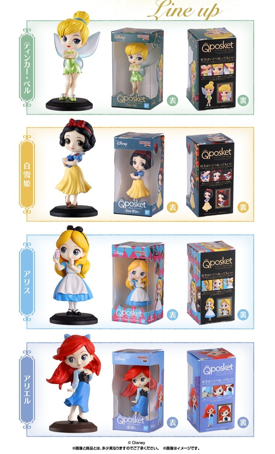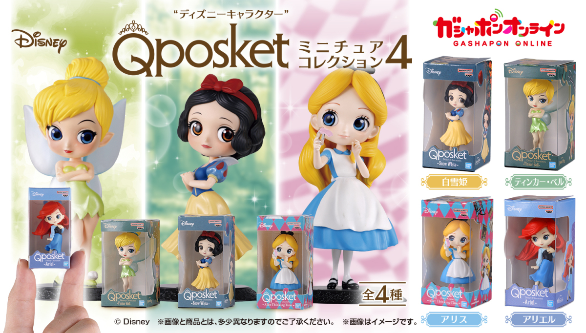 Q posket 人偶景品系列,以高品質 Q(quality)與芬蘭語中的「臉頰」Posket 為設計核心,將角色注入如洋娃娃般可愛的大眼造型。現在以盒裝迷你模型的形式首次在轉蛋機上發售!『Disney Q posket 迷你收藏4』轉蛋將精緻的造型調整為 5 公分的小尺寸,本彈收錄有人氣迪士尼角色:小飛俠的仙子小叮噹,以及白雪公主、愛麗絲、愛麗兒四款角色,並以實際包裝為基礎,忠實再現了Q posket 的細節與品質!