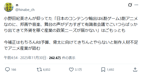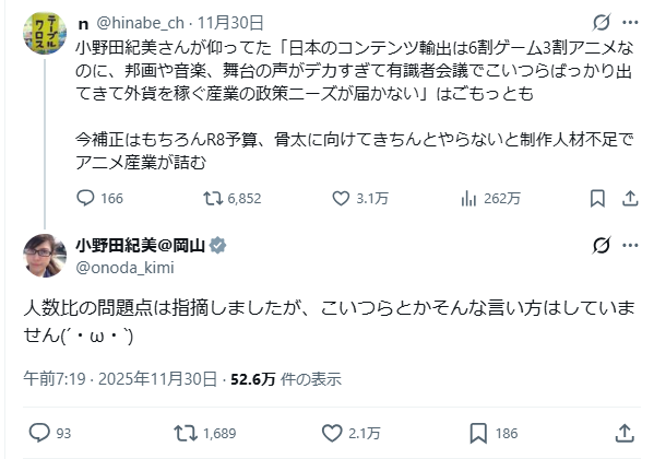 有日本網友點出,小野田大臣提到的現象非常中肯:「日本明明是遊戲六成、動畫三成在撐出口,但開會時被劇場、日本電影、音樂這些專業人士的聲量壓過,真正能賺外匯的產業需求反而傳不上去。」他也強調,如果預算不調整,動畫、遊戲產業會因人力不足直接卡死。