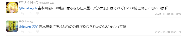 也有人吐槽:「如果能給吉本興業500億,那任天堂、萬代南夢宮應該能拿到2000億吧?」