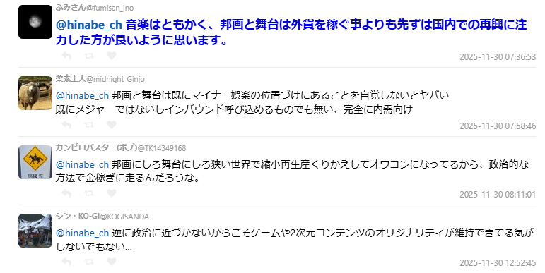 也有人認為:「電影跟舞台應該先把國內市場振興好吧,根本還談不到出口。」、「動畫跟遊戲的品質明明越做越好,但創作者的待遇卻沒跟上。」、「日本的 IP(動畫、遊戲、漫畫)是很強的文化輸出武器,連外國人想學日文、想來日本玩的契機都是靠它們。」