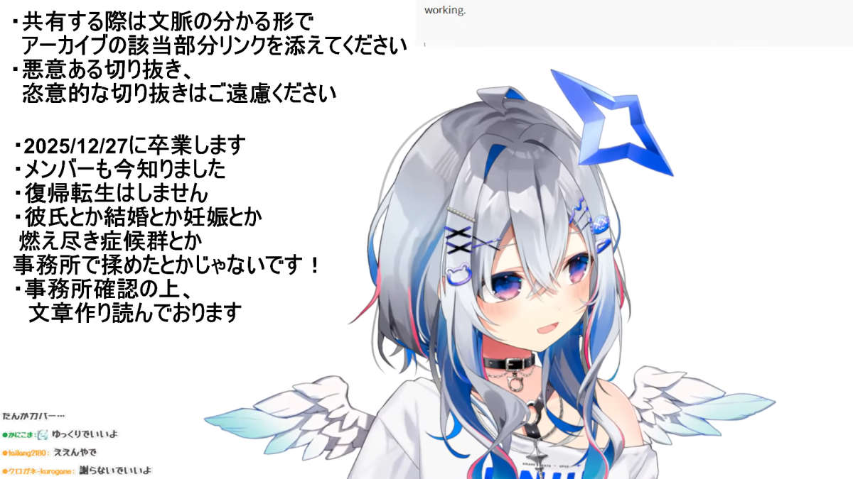 這次的畢業並不是突然決定的,而是幾個月前就已經敲定。不過,為了避免任何相關資訊提前外流,hololive 的成員與大量營運人員都在現在這個公開發表的時間才知道。另外,關於這次的處理方式,是COVER與本人雙方同意後共同作出的結論。