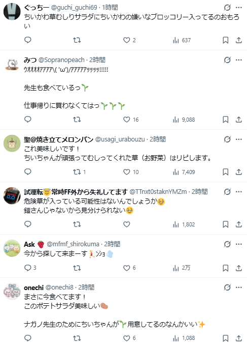 貼文一出,粉絲們狂刷留言:「ナガノ老師本人也吃了!太可愛啦!」、「熊熊竟然吃吉伊拔的草!」、「居然能吃到吉伊拔的草,我現在就衝去 7-11!!」、「吉伊累得半死拔草 → ナガノ老師把草吃掉,這畫面太讚了」