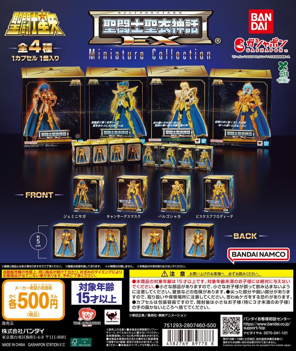「聖闘士聖衣神話EX Miniature Collection」轉蛋系列,將TAMASHIINATIONS發行的「聖闘士聖衣神話EX」系列商品以約 5 公分的迷你尺寸再現,人偶本身和包裝外觀都經過精心還原,甚至連最小的細節都一絲不苟地呈現!