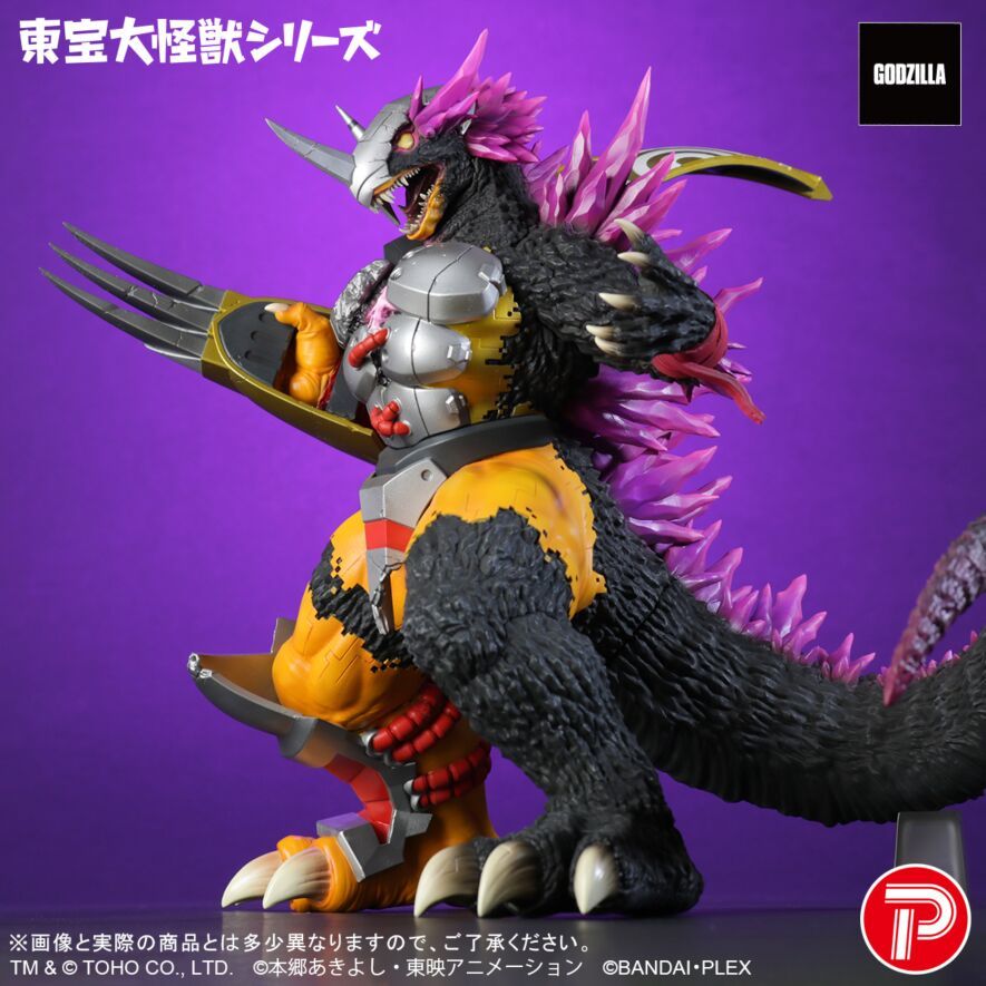 「東寶大怪獸系列 戰鬥暴龍獸:G侵蝕模式」,尺寸約高 26 公分,以遊戲插畫為基礎,重現戰鬥暴龍獸遭G細胞侵蝕的變身形態,捕捉了戰鬥暴龍獸特徵,包含手臂極具威力的恐龍剋星,與背上半邊的勇氣之盾...等,身軀另一半則是刻畫出附滿哥吉拉如岩石斑粗糙的皮膚、從破裂的頭盔至背上都長出粉紫色巨大背鰭的魄力造型!侵蝕交界處的數位格狀,表現出數碼寶貝獨特世界觀。從各角度欣賞,能感受到不同魅力!