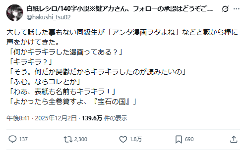 近日日本X上有位推主分享:一位平常不太熟的同學突然跑來問他:「欸你是漫畫宅對吧?有沒有什麼看了會覺得亮晶晶的漫畫?我最近有點憂鬱,想看那種閃亮亮的作品。」他便拿出以精緻寶石角色聞名的作品《寶石之國》推薦對方,這樣的手法,分享在X上後也被網友吐槽到爆炸。