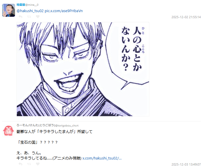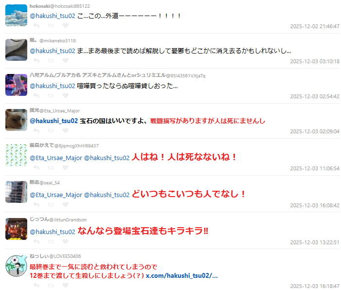 貼文底下瞬間湧入大量苦笑留言:「你這不是借漫畫,是接戰吧。」、「《寶石之國》確實很閃啦……但內容的衝擊度會讓人悟道。」、「戰鬥場面很多啦,不過『人類』是不會死的——人類啦。」、「把最後一集抽掉,只借到第12集,讓對方半死不活,才是真正的地獄模式。」