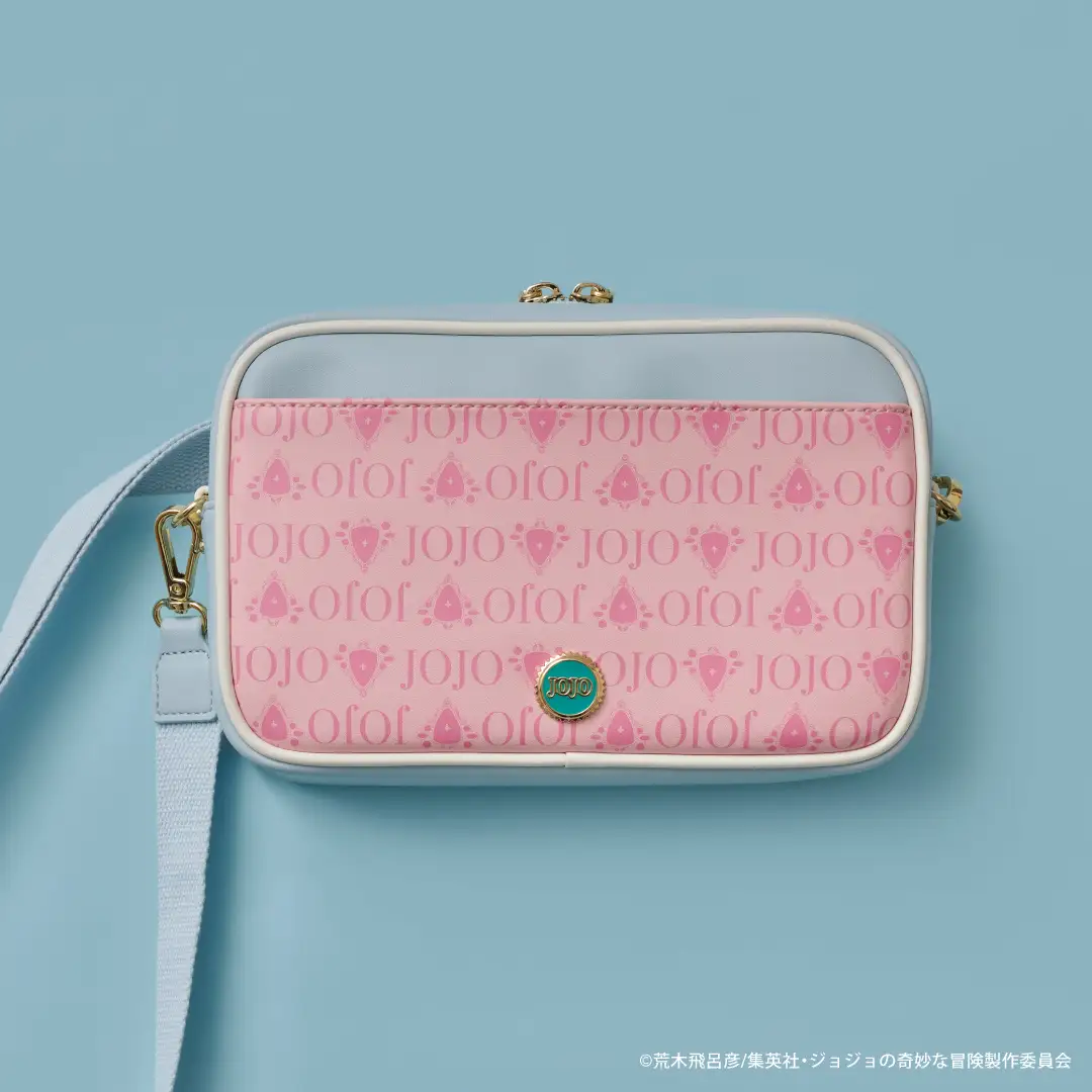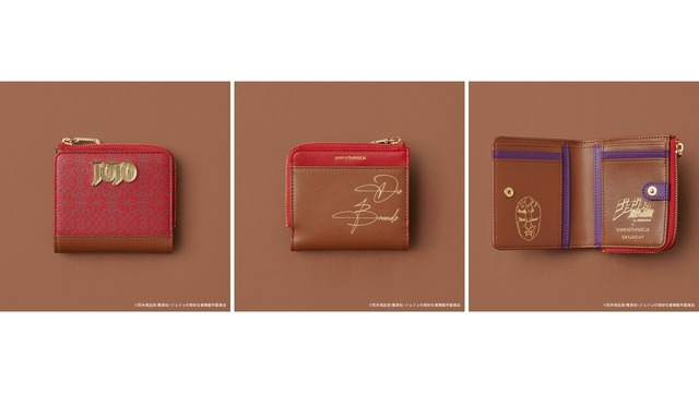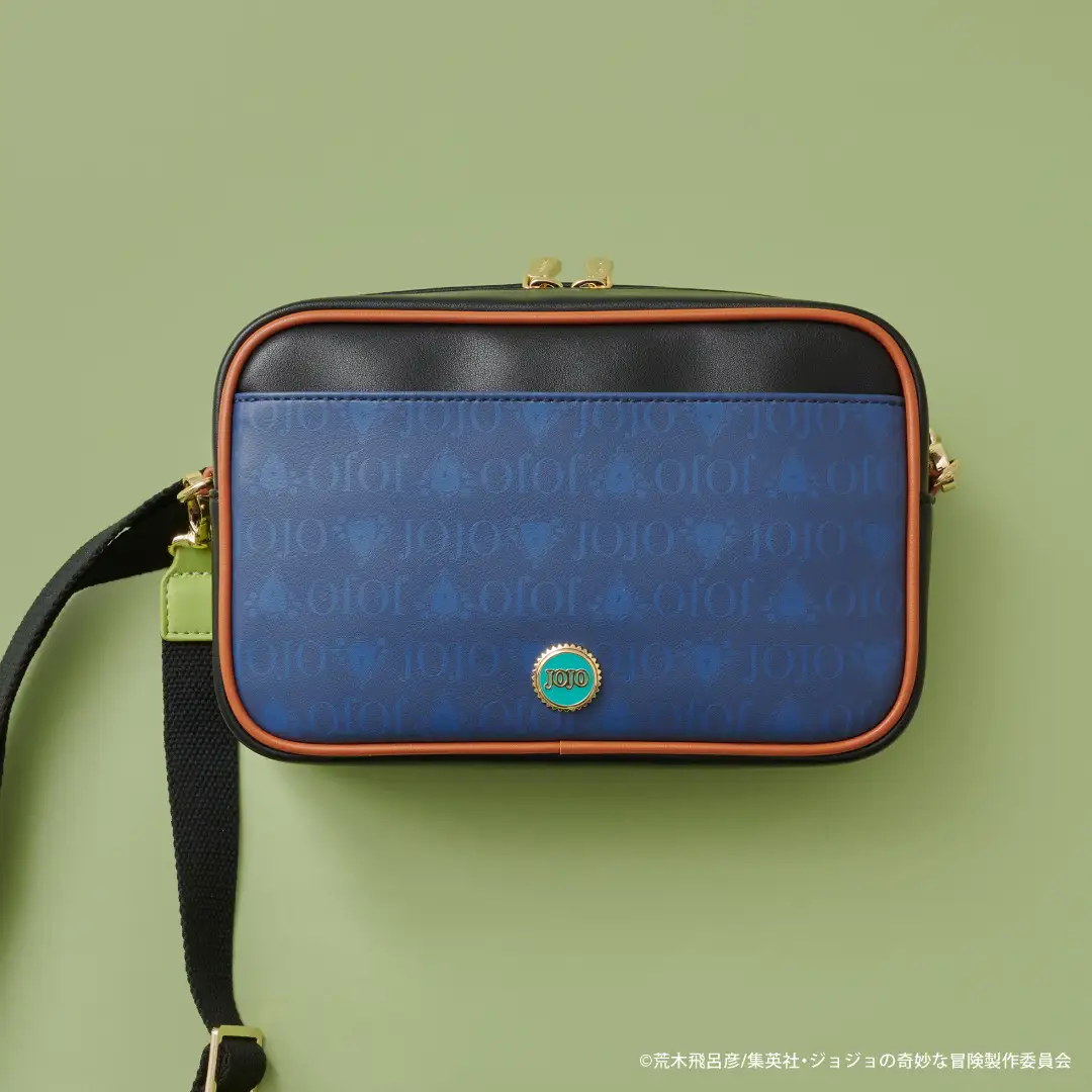包款與短夾都印上喬斯達家招牌壁紙圖樣。包包上有象徵作品的 “JOJO”金屬裝飾,下方也做出喬納森皮帶的造型。附贈的卡套上印有喬納森的簽名 與「幸運與勇氣之劍」的插圖,並附肩背帶,可手提/側背兩用。